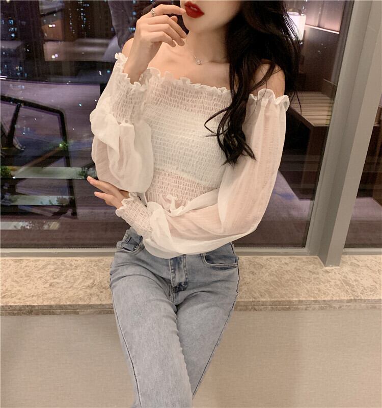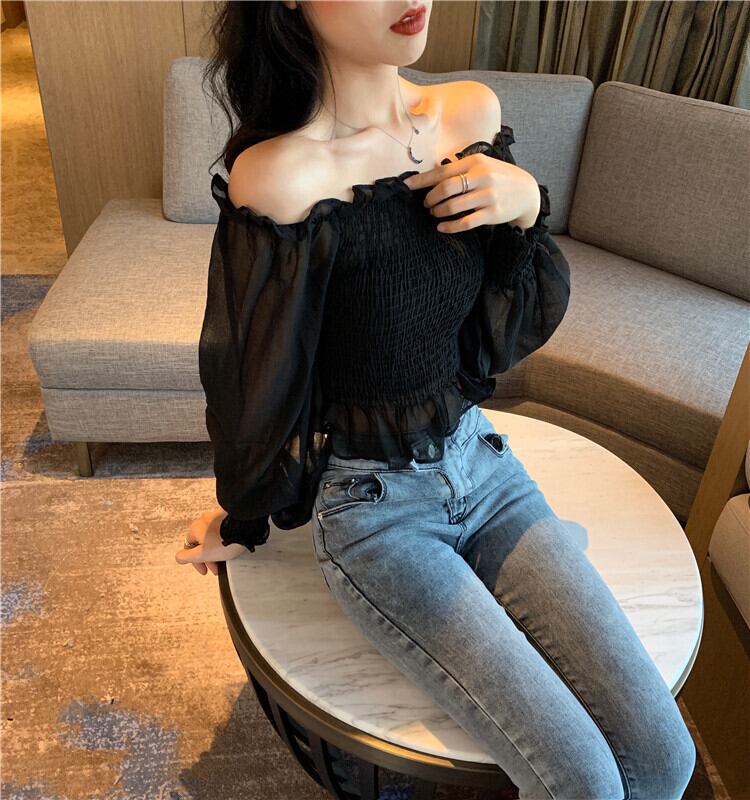 トップス レディース シャツ ブラウス オフショル シフォンシャツ ランタンスリーブ 長袖 かわいい ベルスリーブ ボリューム袖 袖あり シフォン 透け感 へそ出し ショート丈 無地 フリル 大人カジュアル トップス コーデ ホワイト ブラック 白 シャツ 黒 透け感 セクシー おしゃれ 個性的 オフショルダー 肩出し シャーリング 学生 通学 デート 春 秋 10代 20代 30代 新作 db0740