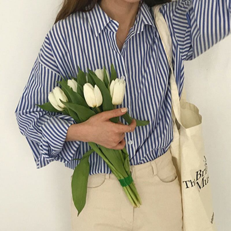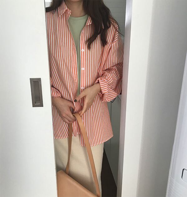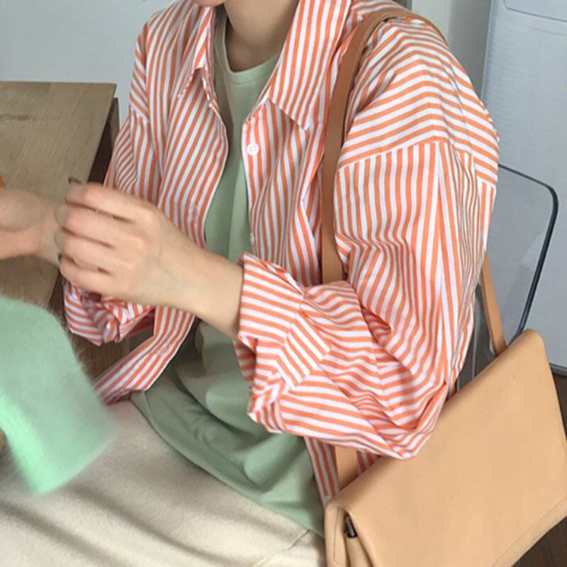 シャツ レディース トップス ブラウス ストライプ 長袖 きれいめ こなれ感 主役級 シンプル さわやか 大人カジュアル コーデ オーバーサイズ トップス 抜け感 ボーダー ブルー 青 オレンジ ルーズ 華やか 上品 おしゃれ ママ スタイル オフィス 通勤 着やせ OL 通勤 学生 通学 デート 春 夏 秋 10代 20代 30代 新作 db0747