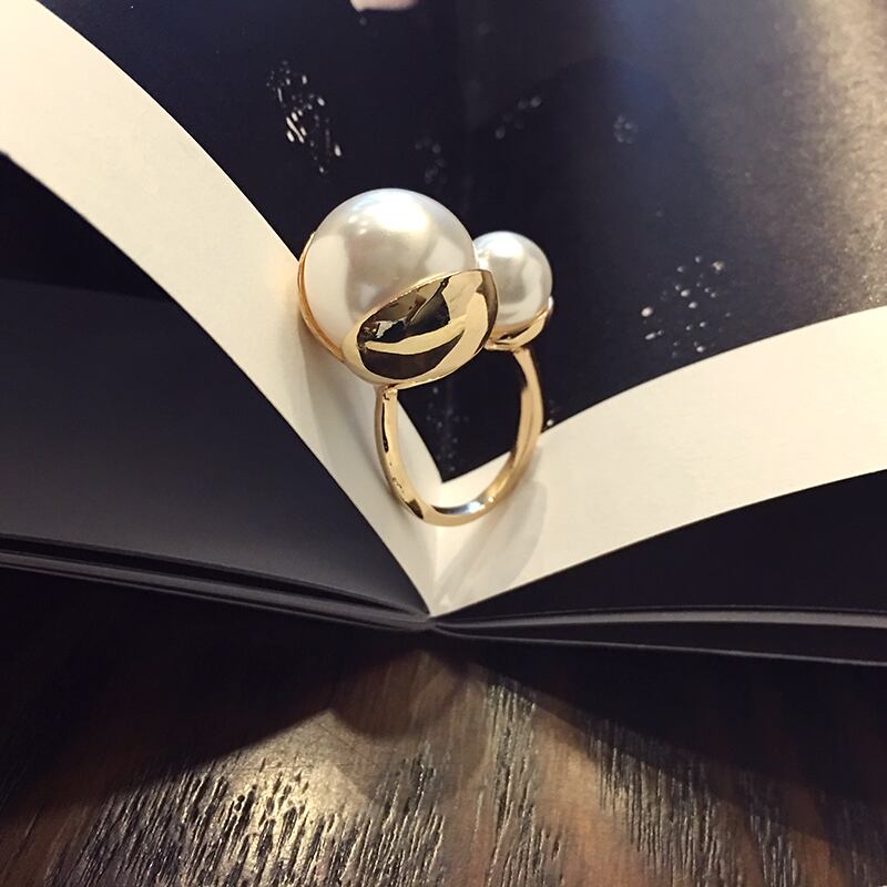 サイズの異なる2つのパールが、指を包み込むようなデザインのリングです。