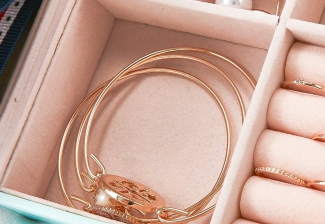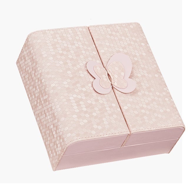バタフライモチーフがアクセントの、スクエアタイプのジュエリーケースです。