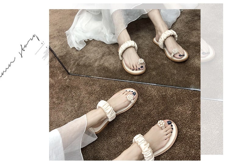 親指部分のパールのお花がアクセントになった、大人可愛いフラットサンダルです。