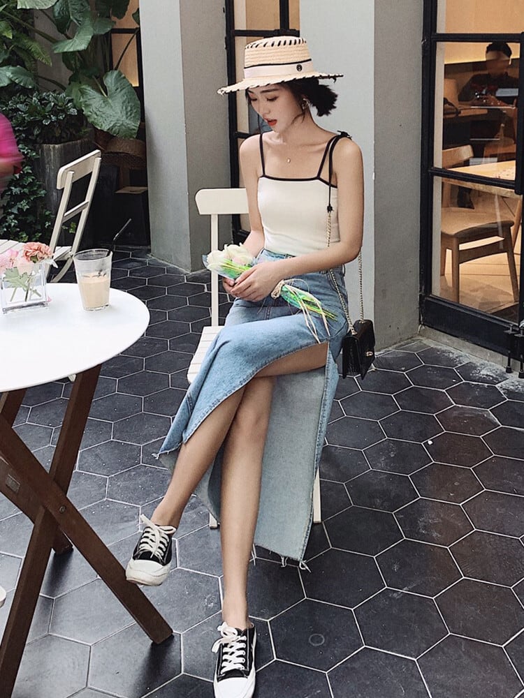 深めのスリットがカジュアルセクシーな、デニムのロングスカートです。