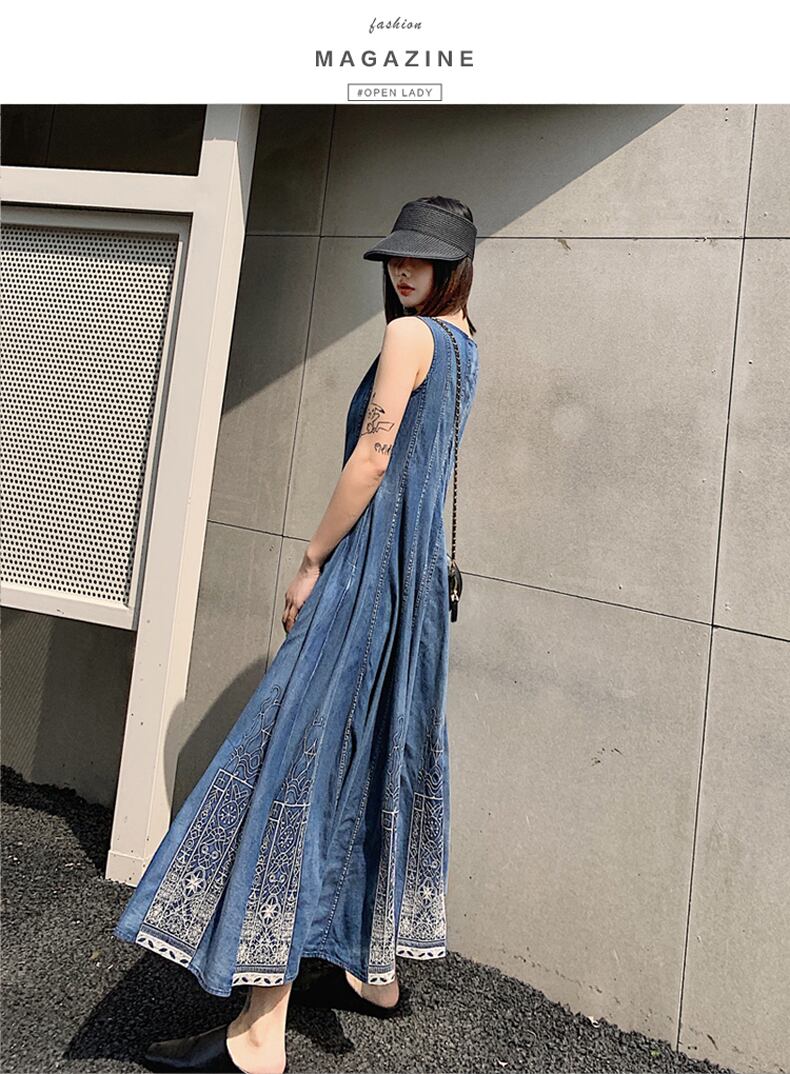デニムワンピース ロング ワンピース レディース デニム おしゃれ エスニック きれいめ 大きいサイズ xl 2xl 3xl ラウンドネック ノースリーブ 刺繍 体型カバー 春 夏 秋 大人カジュアル ワンピース コーデ ミモレ丈 フレア ハイウエスト 個性的 アジアン セレブ かっこいい ワンピース パーティー お出かけ 休日 リゾート デニム ブルー 青 新作 着痩せ 細見え 高級感 10代 20代 30代 40代 新作 韓国 ファッション レディース ワンピース db1016