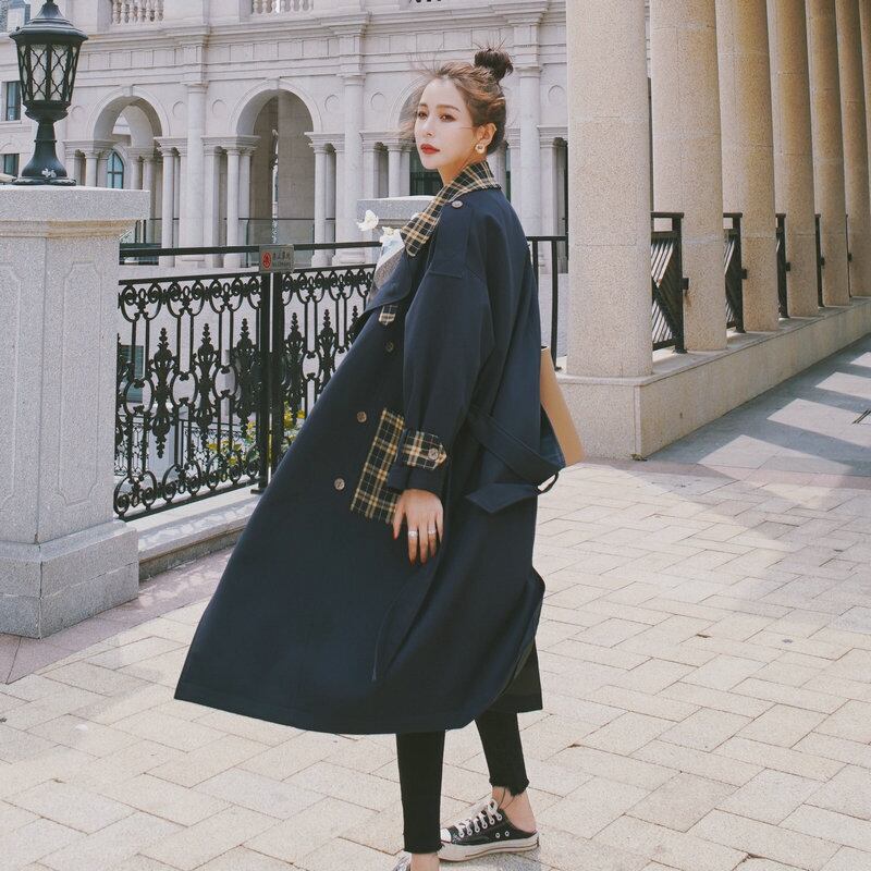 【送料無料】 アウター レディース コート ロング トレンチコート ミモレ丈 切り替え バイカラー ネイビー チェック柄 大人カジュアル 長袖 トラッド ウインドブレーカー 無地 格子縞 紺 ミドル丈 女子 抜け感 ゆったり セレブ きれいめ おしゃれ ベルト お出掛け 旅行 S M L XL 大きいサイズ 秋 冬 10代 20代 30代 OL 通勤 オフィス きれいめ かっこいい かわいい 韓国 ファッション レディース トレンド コーデ db1095