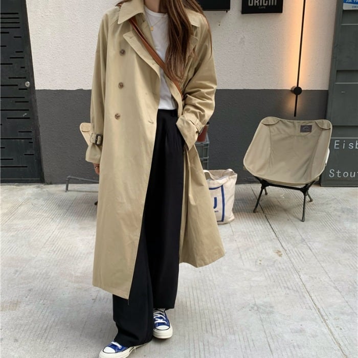 【送料無料】 2色 トレンチコート アウター レディース コート ロング 薄手 シンプル 無地 大人カジュアル プチプラ コーデ ウインドブレーカー 長袖 ブラック 黒 カーキ オーバーサイズ 春 秋 10代 20代 30代 OL 通勤 オフィス 韓国 ファッション レディース トレンド ルーズ こなれ感 着痩せ 細見え ゆったり ワンマイル db1107