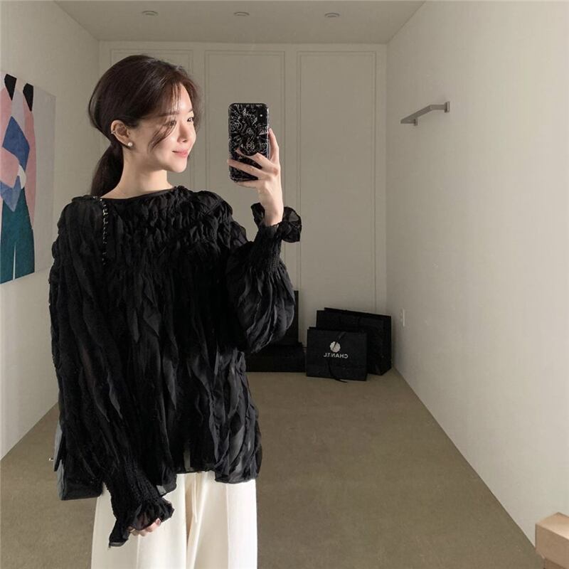 【送料無料】 2色 トップス レディース シャツ ブラウス 長袖 プリーツ 黒 無地 きれいめ プルオーバー ゆったり シンプル パフスリーブ レトロ 大人女子 おしゃれ カジュアル アプリコット ベージュ フレンチ シック フリーサイズ 春 秋 10代 20代 30代 ロングシャツ とろみ感 フェミニン OL オフィス 休日 デート トレンド 韓国 ファッション コーデ スタイル db1130