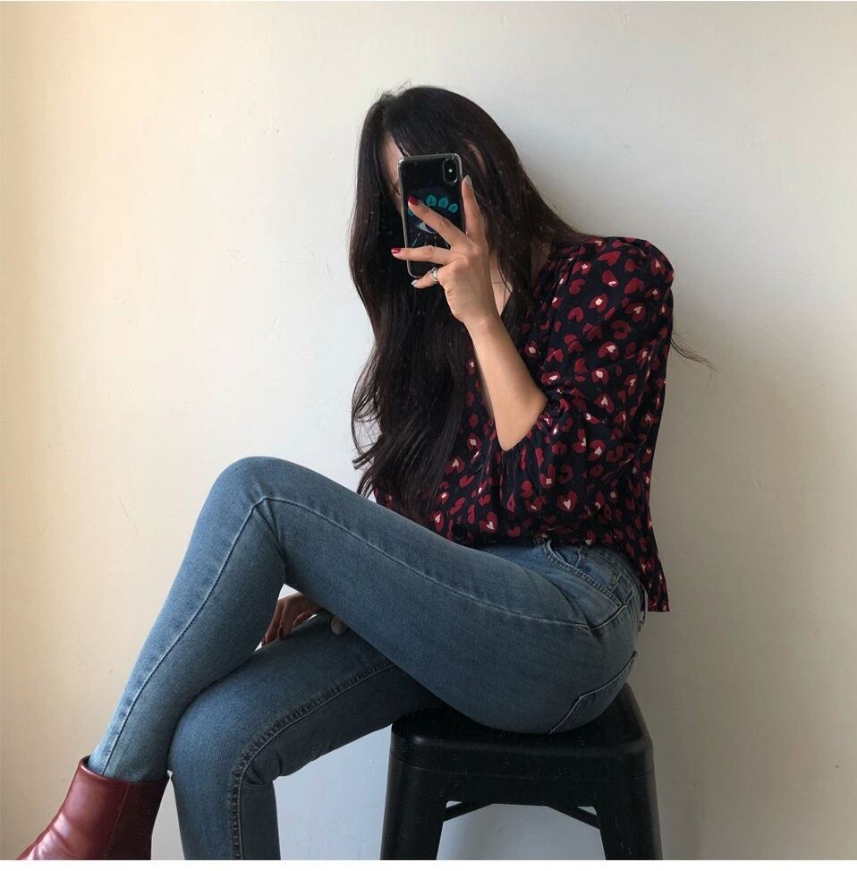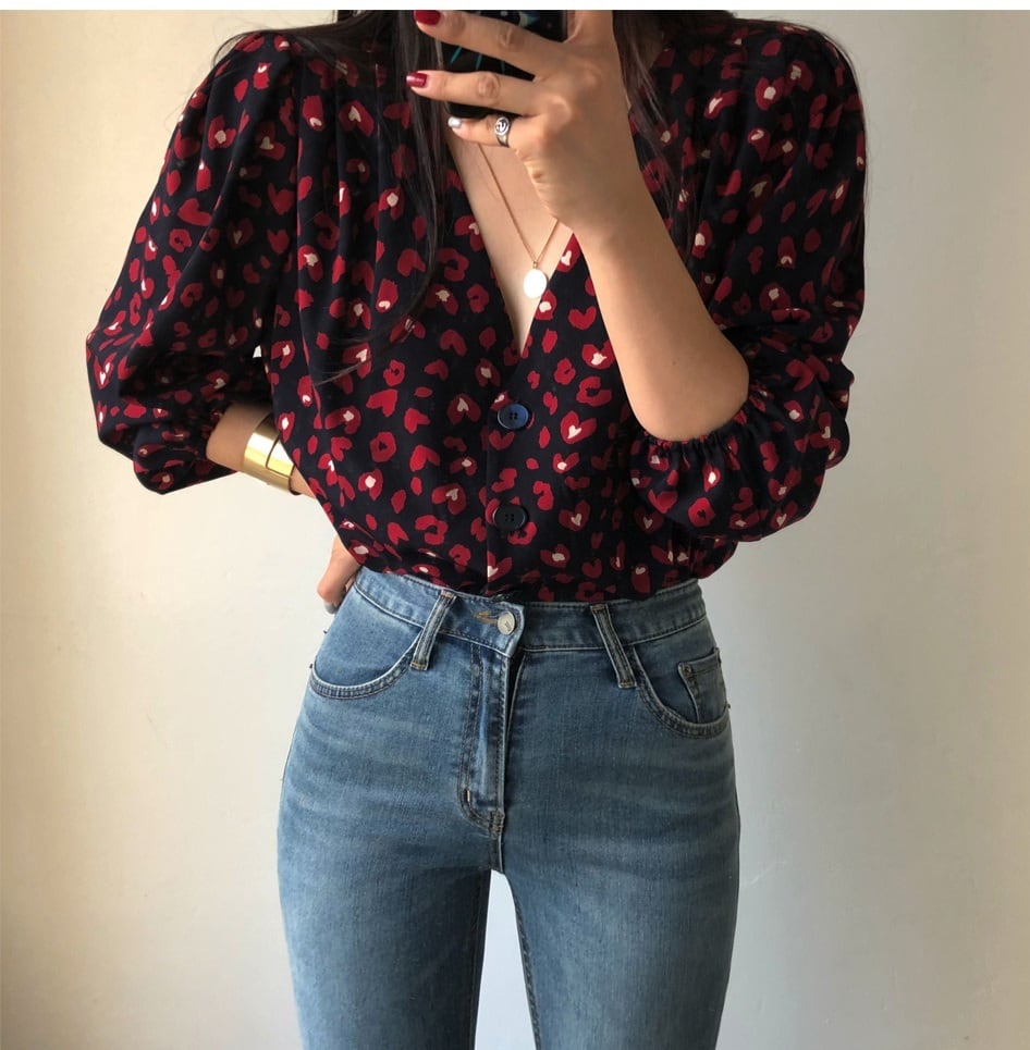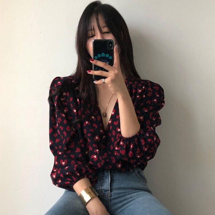 【送料無料】 トップス レディース シャツ ブラウス Vネック ブラック 黒 ハート柄 七分袖 レトロ 大人可愛い セクシー カジュアル ボリューム袖 大人カジュアル フリーサイズ 春 秋 10代 20代 30代 かわいい シック フェミニン 大人女子 おしゃれ OL オフィス 休日 デート トレンド 韓国 ファッション シャツ コーデ スタイル db1132