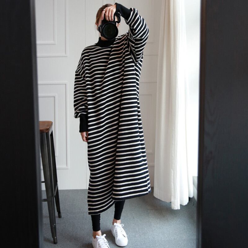 【送料無料】 ワンピース レディース ロング ミモレ丈 ボーダー ハイネック ロングワンピース 定番 スリット 黒 白 ストライプ ゆったり 大きめ ビッグサイズ リラックス コーデ リブ シンプル かっこいい 春 秋 10代 20代 30代 大人カジュアル ワンピース コーデ ロングワンピ S M L XL 大きいサイズ トレンド 細見え スリット 普段着 着回し 旅行 ラフ こなれ感 こなれ感 トレンド 韓国 レディース ファッション db1150