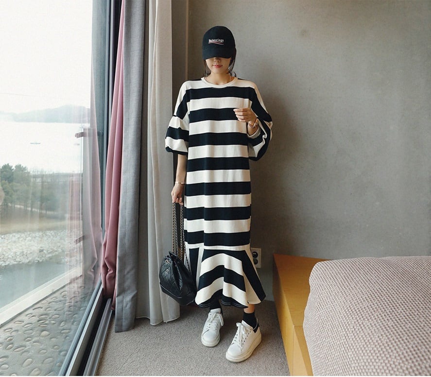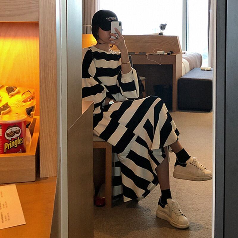 【送料無料】 ワンピース レディース ロング ミモレ丈 ボーダー ラウンドネック おしゃれ 大人カジュアル ロングワンピース 定番 ペプラム 長袖 ボリューム袖 切り替え デザイン ドロップショルダー 黒 白 春 秋 10代 20代 30代 きれいめ ワンピース コーデ ロングワンピ ゆったり S M L XL 大きいサイズ トレンド ラフ オーバーサイズ リラックス リゾート 旅行 抜け感 モノトーン 個性的 韓国 レディース ファッション ワンピース db1151