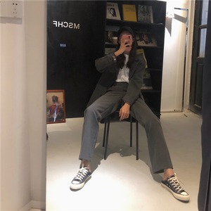 長めジャケットとハイウエストのストレートパンツ