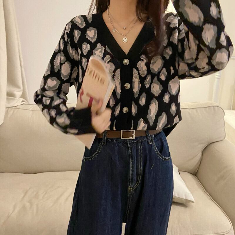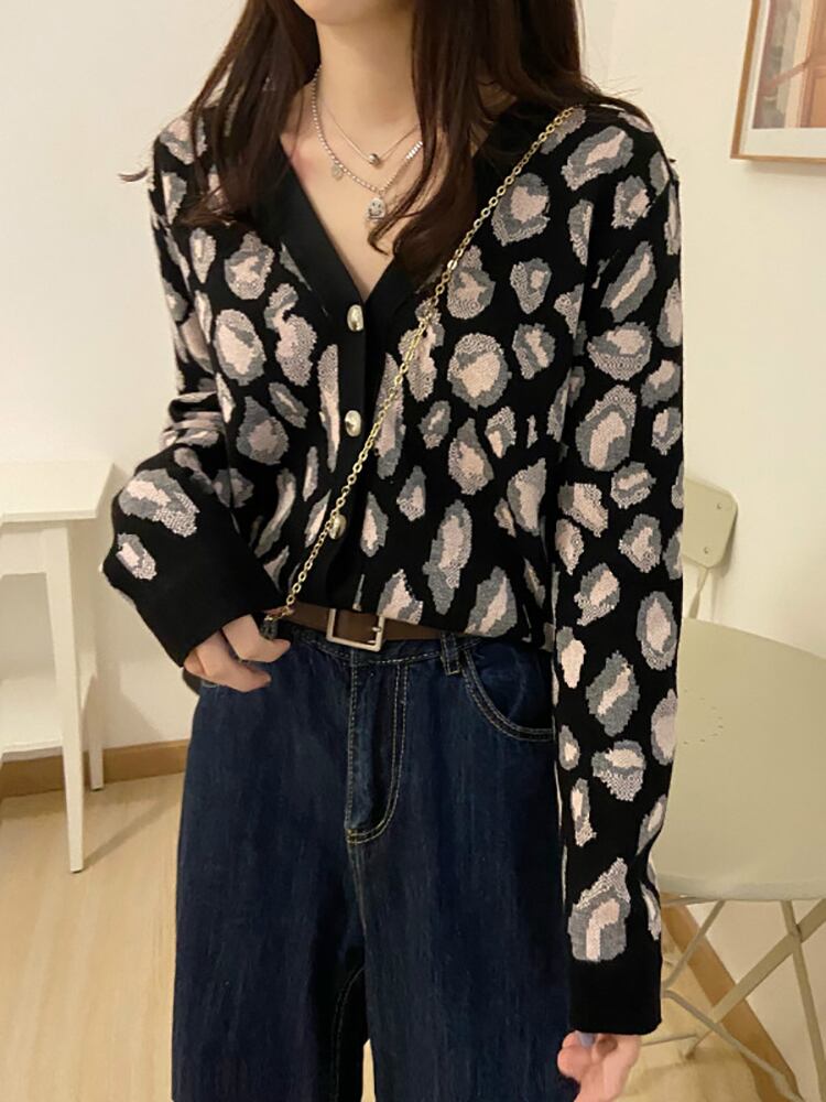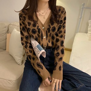 レトロな雰囲気のヒョウ柄のVネックカーディガン。