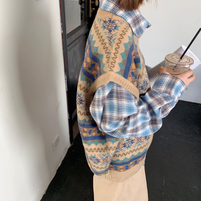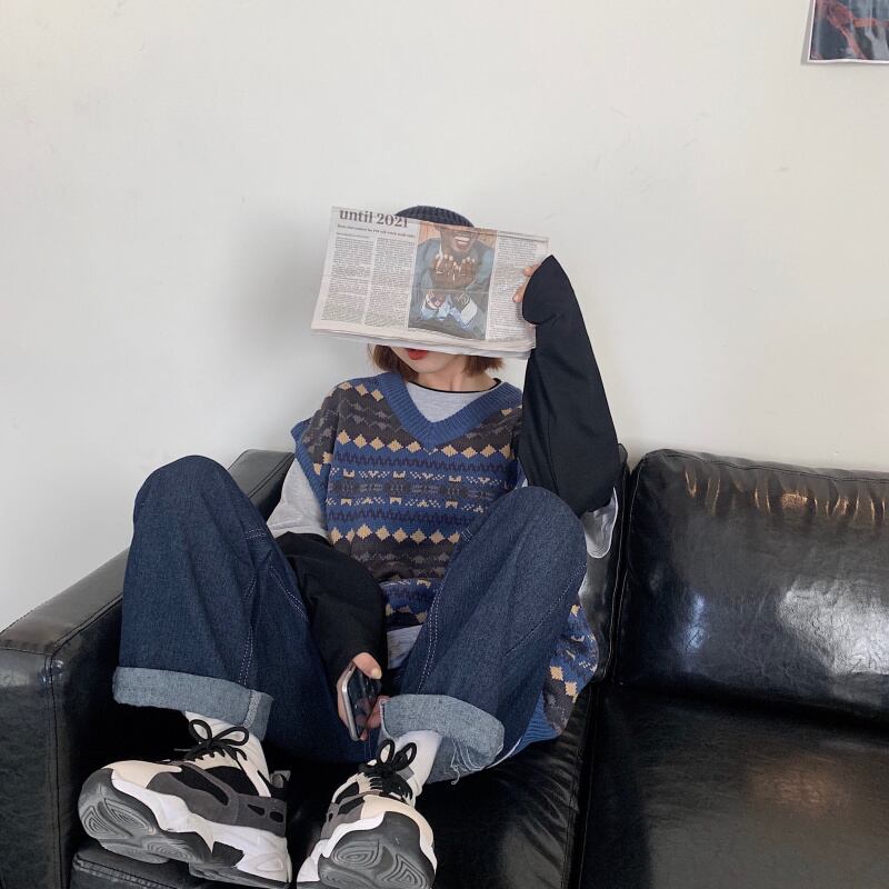 【送料無料】 2色 ニット ベスト レディース トップス 重ね着 ルーズ Vネック ビッグサイズ おしゃれ 柄 レトロ カジュアル 可愛い トラッド オーバーサイズ ドロップショルダー ノースリーブ 大きめ ゆったり マニッシュ こなれ感 トップス コーデ 通学 学生 ブルー 青 カーキ アーガイル風 10代 20代 30代 秋 冬 トレンド 韓国 ファッション 普段着 着回し お洒落 存在感 db1310