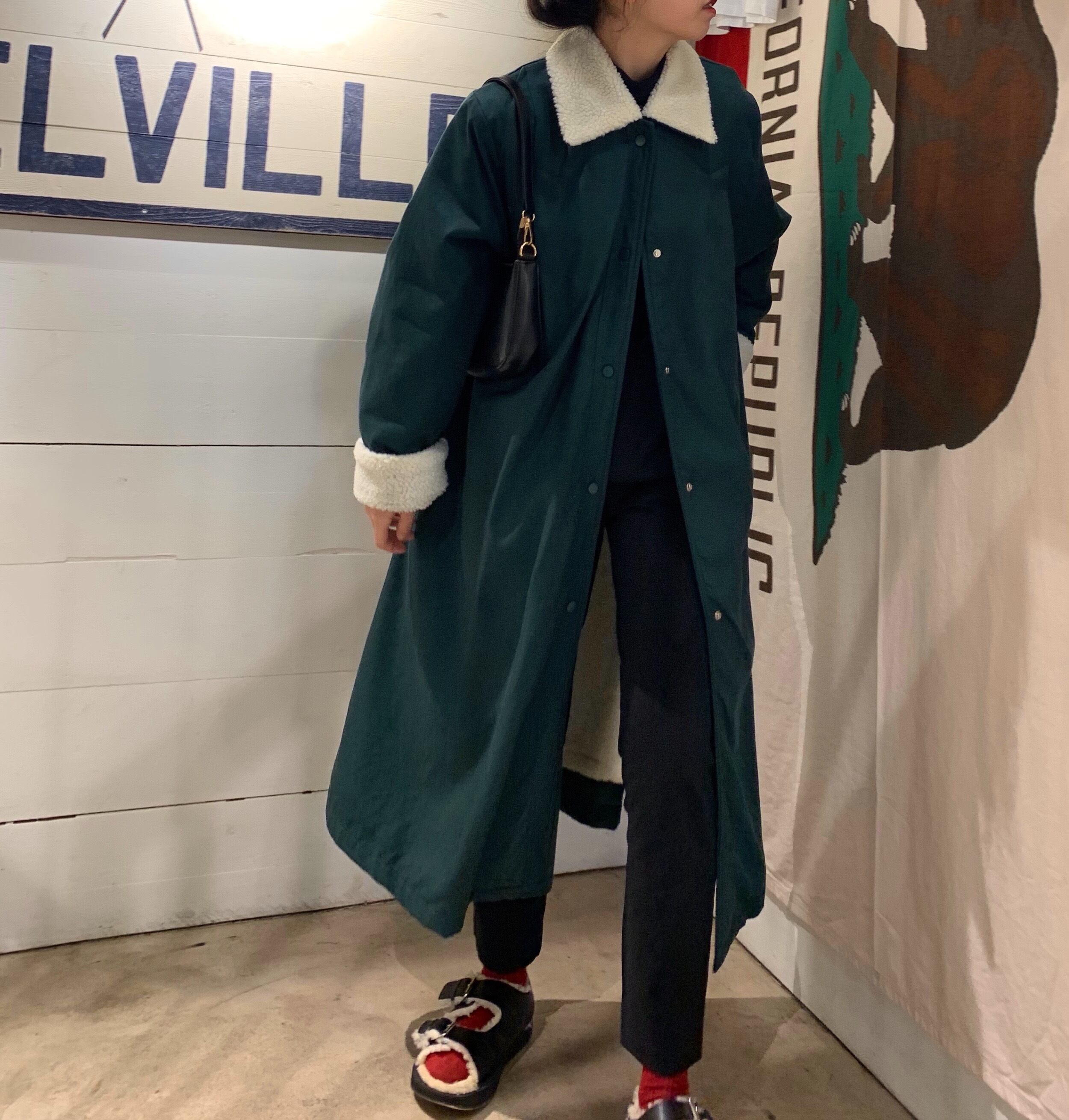 襟&袖口のもこもこボアがアクセントのロングコート