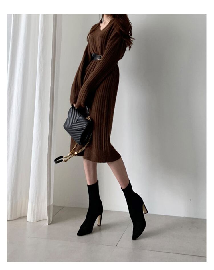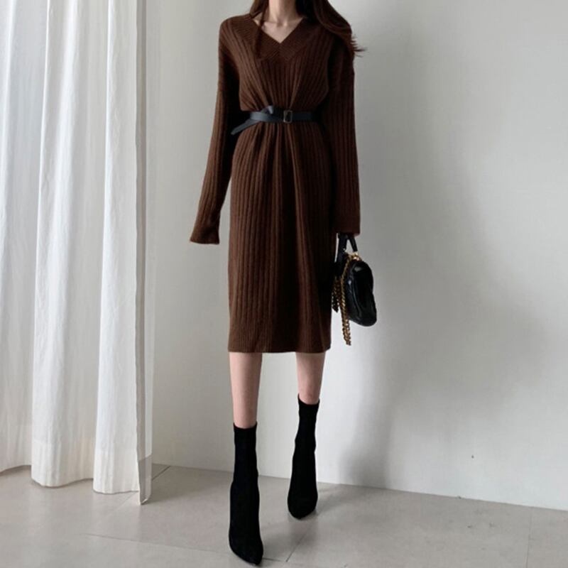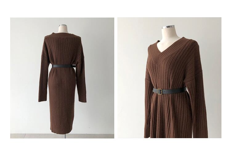 【送料無料】 2色 ワンピース ニット ひざ丈 ミモレ丈 リブ Vネック 大人かわいい きれいめ おしゃれ ミディ丈 ニットワンピ ベルト付 リブニット 無地 長袖 ウエストマーク シンプル シック 大人 ストレート タイト デート 通学 学生 通勤 OL オフィス ブラウン ベージュ 10代 20代 30代 秋 冬 トレンド 韓国 ファッション こなれ感 抜け感 モテ コーデ db1275