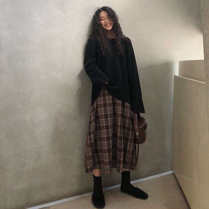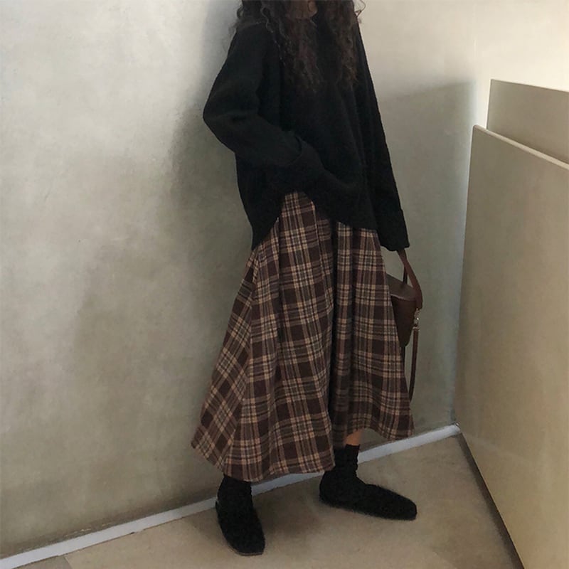 【送料無料】 スカート レディース ミモレ丈 チェック柄 格子縞 Aライン フレア ボトムス ブラウン 茶色 ハイウエスト レトロ シック 大人っぽい カジュアル 大人かわいい スカート コーデ ロング丈 着回し ラフ デート 学生 通学 通勤 OL オフィス 10代 20代 30代 秋 冬 トレンド 韓国ファッションお洒落 スタイル ロングスカート チェックスカート db1308