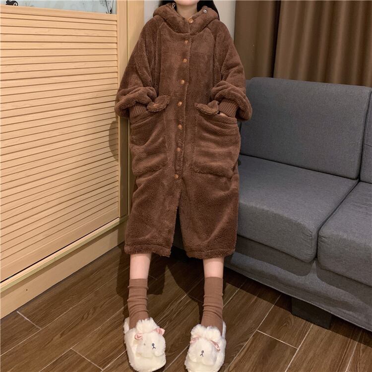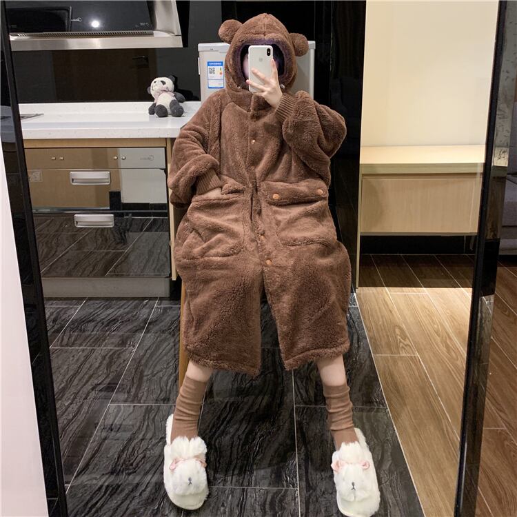 【送料無料】 もこもこ ルームウェア レディース くま かわいい ガウン ワンピース パジャマ 秋 冬 フード付き 耳付き 寝巻き モコモコ 部屋着 ホームウェア ラブリー ガーリー ブラウン クマさん ポケット 前開き フリース インスタ映え キュート 防寒 暖かい お揃い コーデ 可愛い 女子会 お泊まり 長袖 ポケット フード付き 10代 20代 韓国 ファッション ナイトウェア 膝掛け 上着 db1326