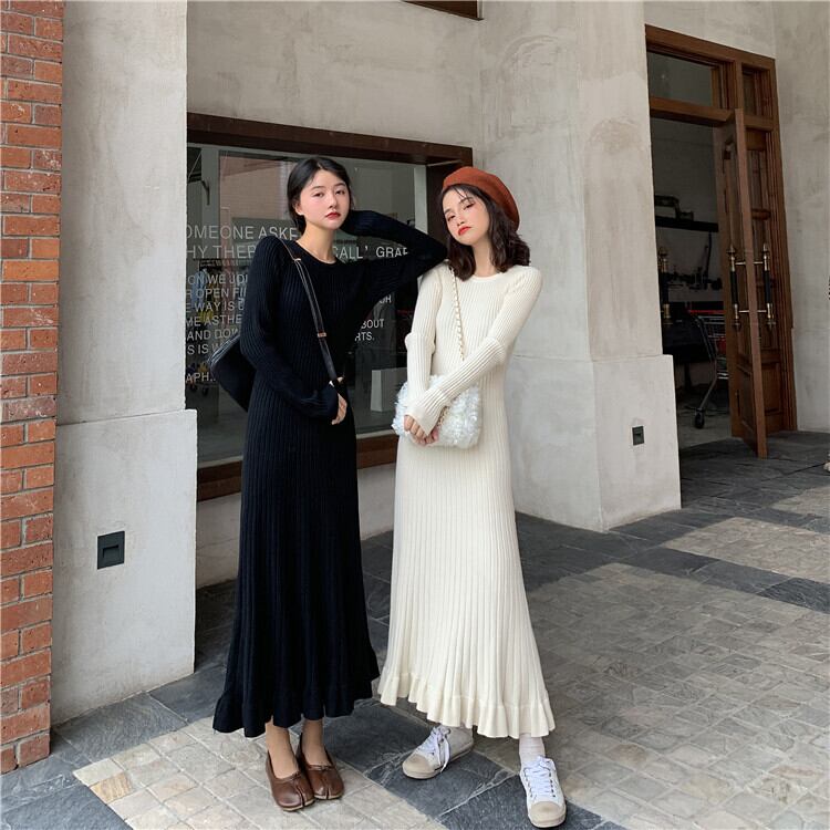 【送料無料】 ワンピース ニット ロング レディース 秋 冬 大人かわいい ワンピース リブニット フリル 双子 お揃い コーデ 黒 無地 アプリコット 韓国 ファッション ラウンドネック 長袖 スリム きれいめ 10代 20代 おしゃれ シンプル 大人可愛い ベージュ カジュアル 普段使い 重ね着 大きいサイズ S M L XL db1327