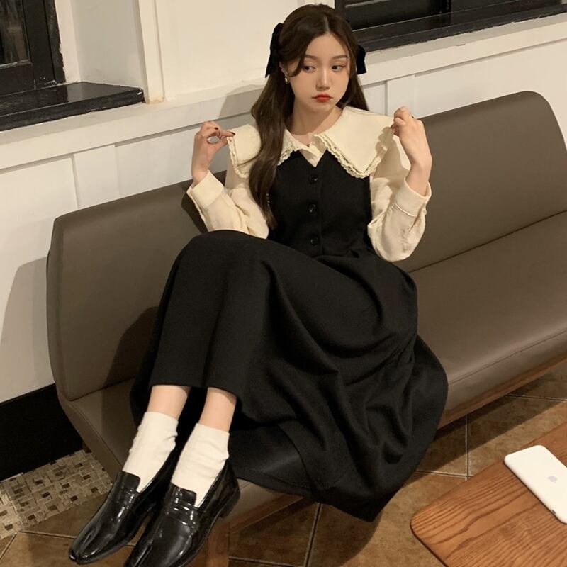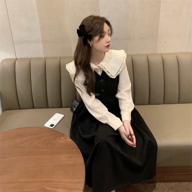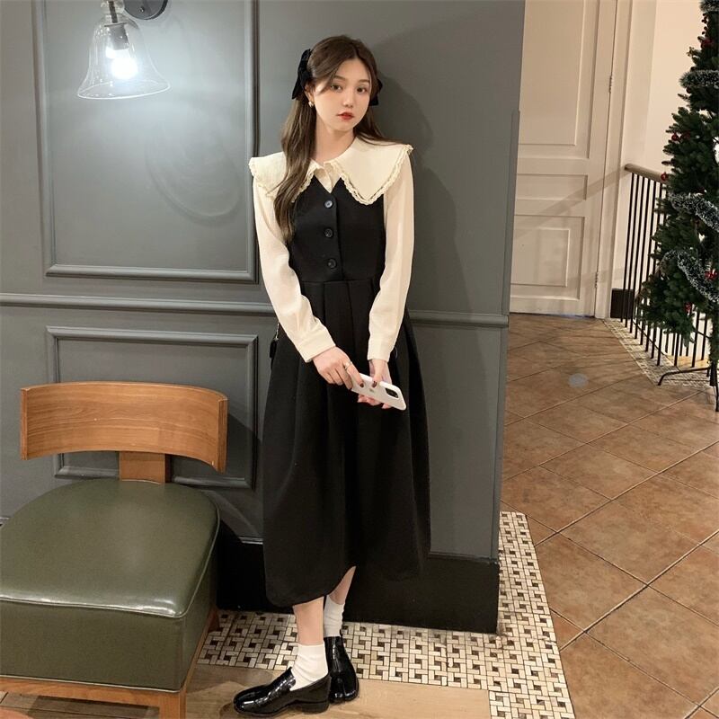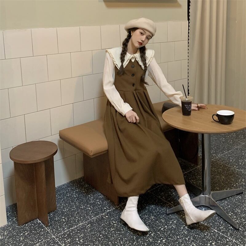【送料無料】 2色 セットアップ レディース ワンピース ブラウス 2点セット かわいい レトロ ガーリー ジャンパースカート ジャンスカ ロング ミモレ丈 カジュアル 大人可愛い シャツ 無地 ブラウン ブラック プリーツ 襟付き Vネック Aライン キュート デート 通学 学生 おしゃれ こなれ感 10代 20代 秋 春 トレンド 人気 女子力 インスタ映え 韓国 ファッション ラブリー カジュアル お嬢様 コーデ db1342