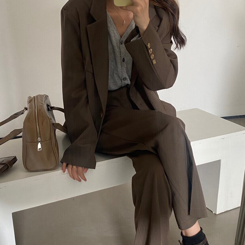 【送料無料】セットアップ レディース 2点セット ジャケット ワイドパンツ シンプル 無地 きれいめ かっこいい スーツ 上下セット パンツ ハイウエスト こなれ感 ラフ 着回し カーキ ブラウン ファッション デート 通学 学生 OL 通勤 オフィス ハンサム 10代 20代 30代 秋 冬 春 トレンド 人気 女子力 スタイルアップ 美脚 長袖 ルーズ マニッシュ 韓国 ファッション ツーピース db1345