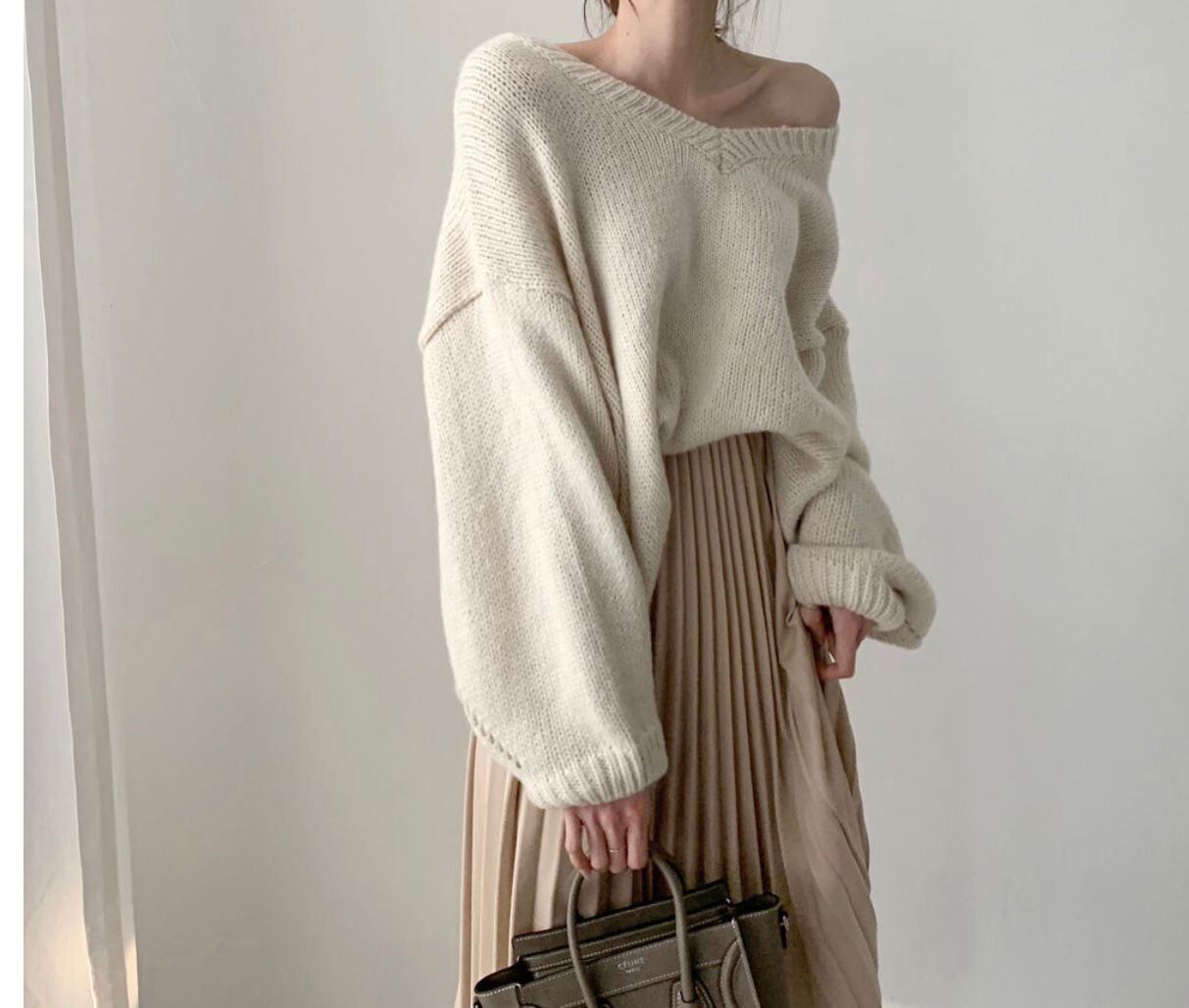 ボリューミーなVネックニットとプリーツスカートのセットアップです