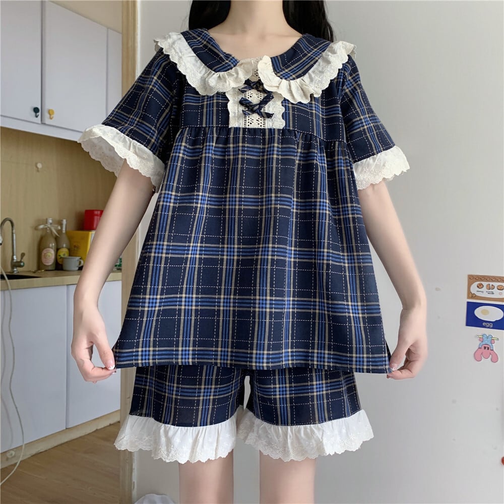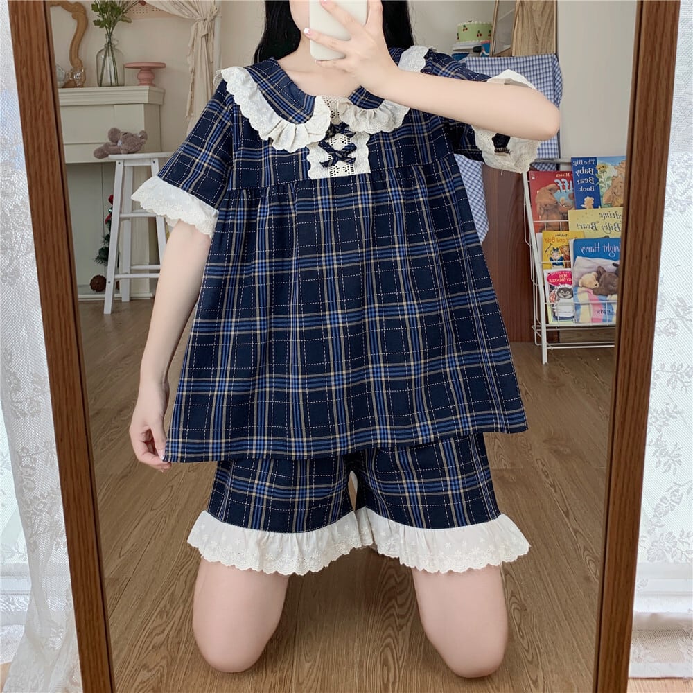 【送料無料】 パジャマ レディース ルームウェア 上下セット 半袖 ワンピース チェック柄 レース フリル かわいい おしゃれ レトロ ガーリー 寝巻き 部屋着 ホームウェア 青 ブルー 格子柄 セットアップ 2点セット ショートパンツ 春 夏 インスタ映え 女子会 お泊まり 10代 20代 30代 韓国 ファッション ガーリー ラブリー パジャマ 人気 お洒落 おうち コーデ キュート スウィート ワンサイズ ホームウェア 女っぽ db1353