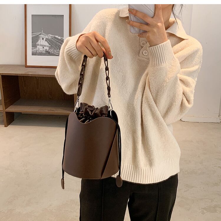 人気のバケツ型バッグに中身の見えない巾着型デザインの組み合わせ