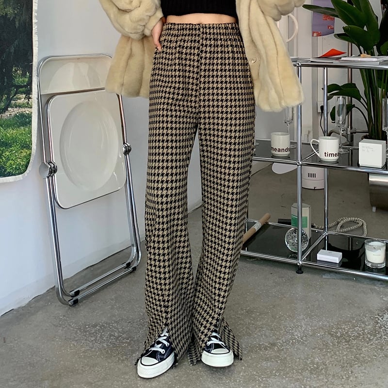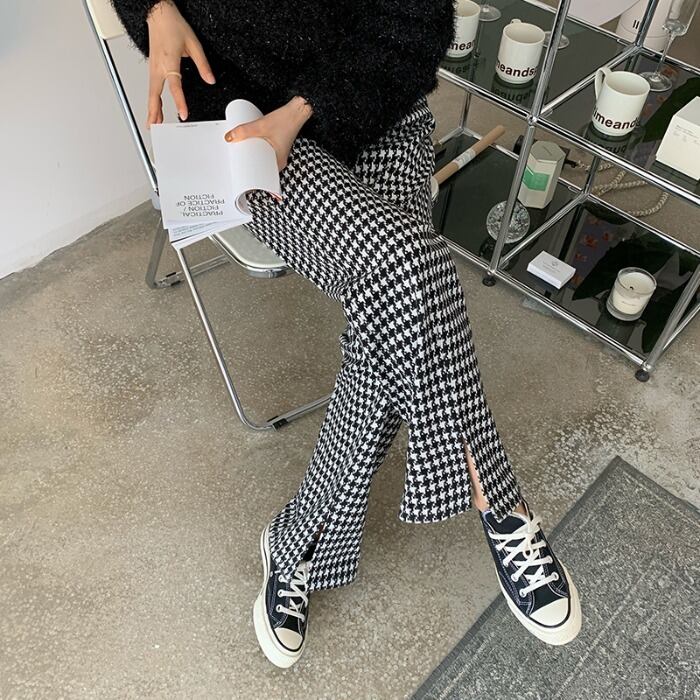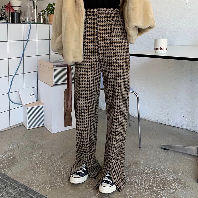 【送料無料】 2色 パンツ レディース チェック柄 千鳥格子 ズボン ボトムス 大人可愛い ルーズ カジュアル ストレート ワイドパンツ 切れ込み かっこいい ハイウエスト ウエストゴム センタープレス スリット 黒 茶色 ブラック ブラウン お洒落 ゆったり 楽ちん 着回し ヘビロテ ロング デート 学生 通学 10代 20代 30代 春 秋 冬 こなれ感 個性的 存在感 トレンド 韓国 ファッション 着回し アイテム ラフ コーデ モノトーン db1384