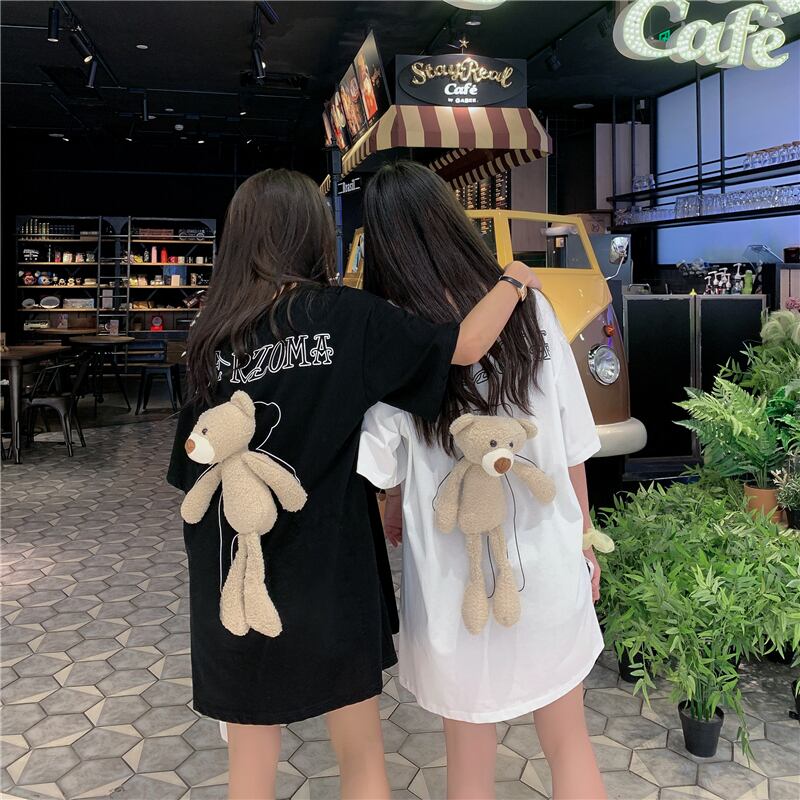 【送料無料】 Tシャツ トップス レディース ぬいぐるみ付 大きいサイズ XL 2XL 3XL 4XL 5XL 白 黒 モノトーン クマ プルオーバー クルーネック 無地 ミニワンピ 大人かわいい おしゃれ 個性的 バックコンシャス ルーズ 大人カジュアル コーデ 半袖 デート 通学 学生 ブラック ホワイト 主役級 10代 20代 春 夏 秋 韓国 ファッション トレンド ワンピース マスコット インスタ映え キュート クマさん お揃い 双子 コーデ db1415