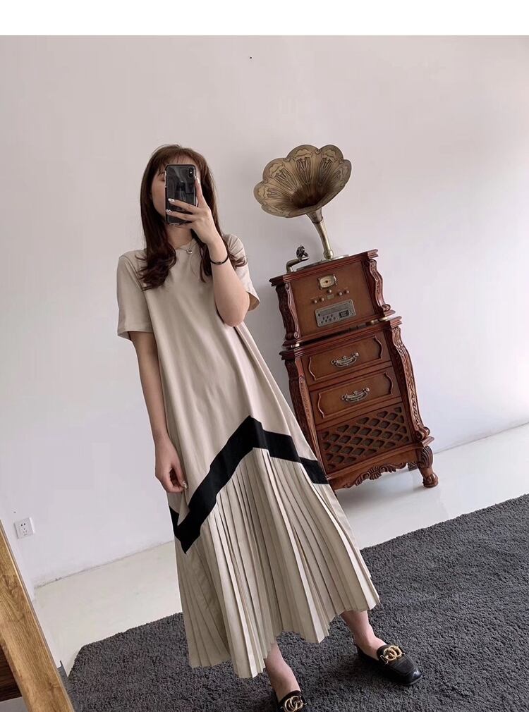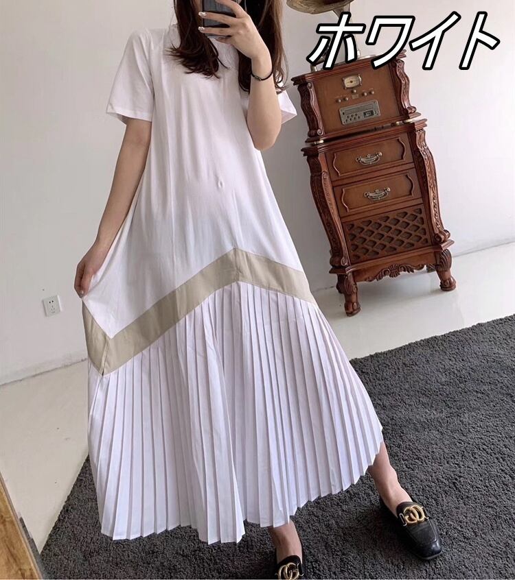【送料無料】3色 ワンピース レディース ロングワンピース ミディアム丈 膝下 プリーツスカート ロングスカート おしゃれ 大人可愛い 半袖 個性的 きれいめ エレガント 上品 バイカラー ラウンドネック Aライン 襟なし 華やか 白 カーキ 黒 ホワイト ブラック ベージュ ニュアンスカラー 大人 こなれ感 インスタ映え アイテム 韓国 ファッション くすみカラー コーデ お出かけ 休日 10代 20代 30代 40代 春 夏 抜け感 オシャレ ゆったり 柔らかい 体型カバー 楽ちん db1520