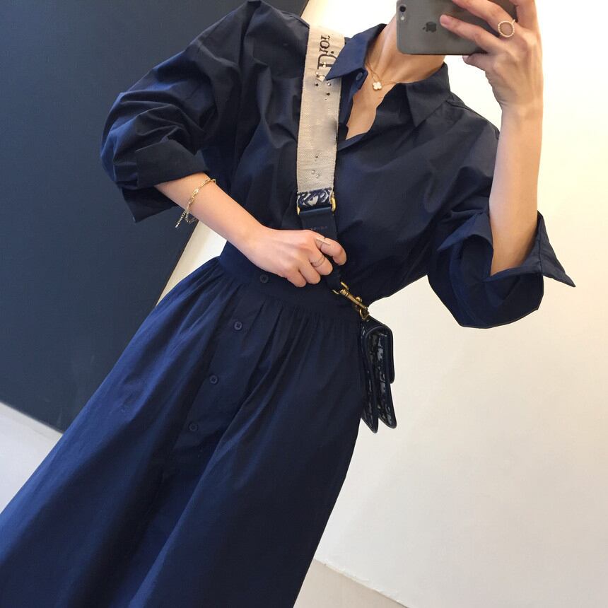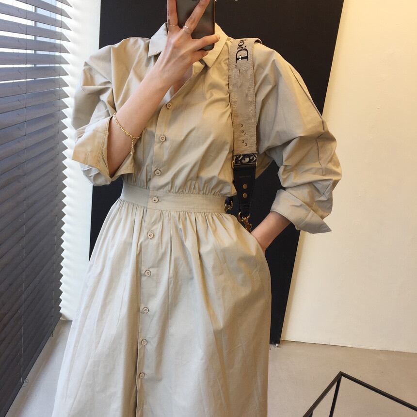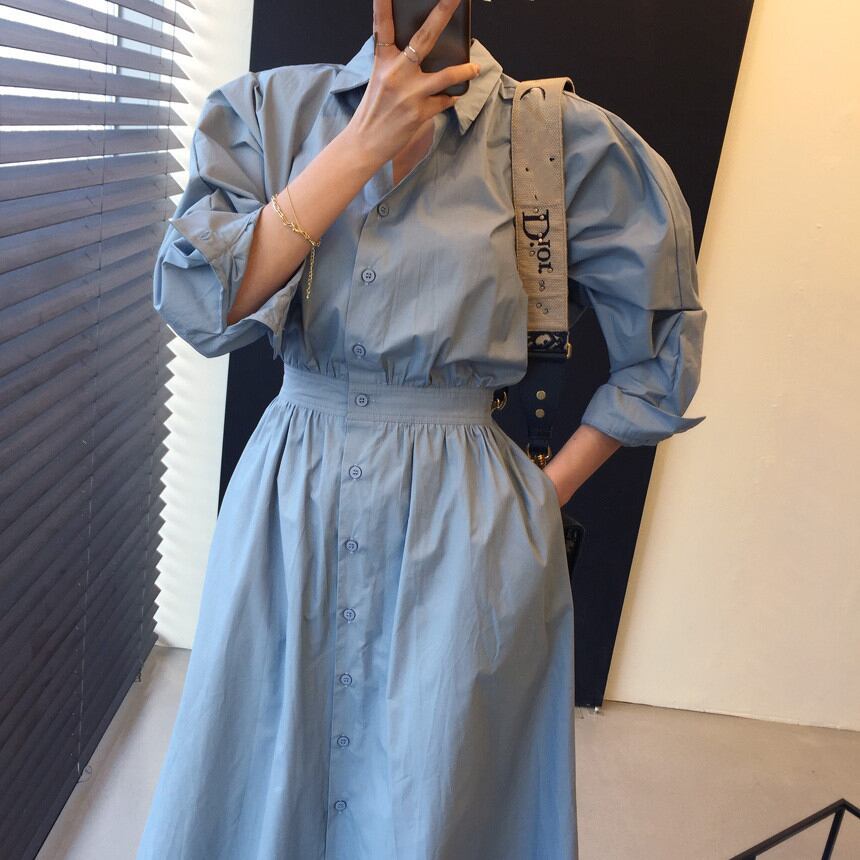 【送料無料】3色 ワンピース レディース ロング ロングスカート シャツワンピース おしゃれ 大人可愛い 長袖 個性的 エレガント きれいめ ゆったり オーバーサイズ 襟つき シンプル ボタン 華やか レトロ スタイリッシュ カーキ ライトブルー ネイビー ベージュ 水色 紺 クール こなれ感 インスタ映え アイテム 韓国 ファッション 大人カジュアル コーデ デート 通学 学生 休日 お出かけ 主役級 10代 20代 30代 春 秋 トレンド 抜け感 オシャレ ハイウエスト 無地 db1522