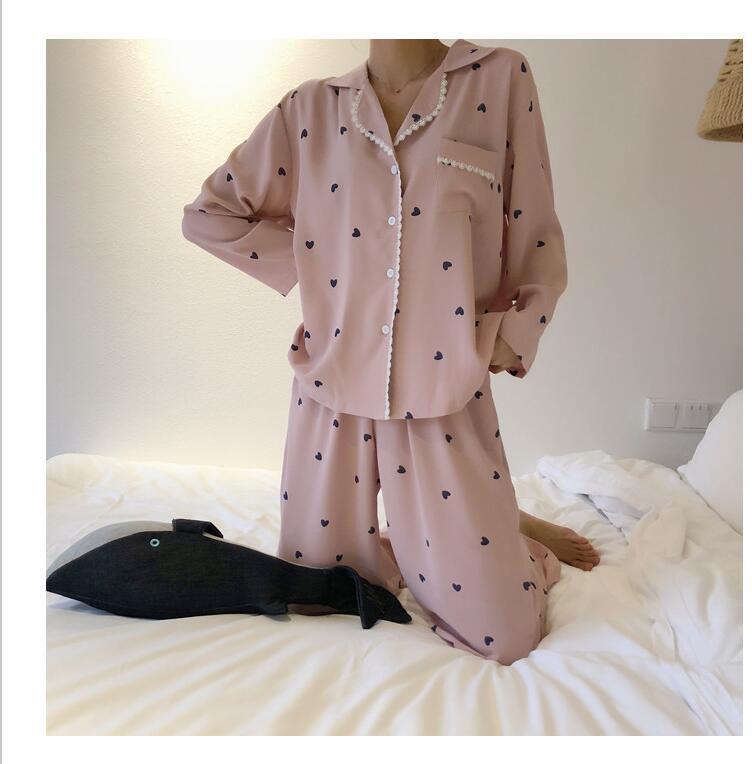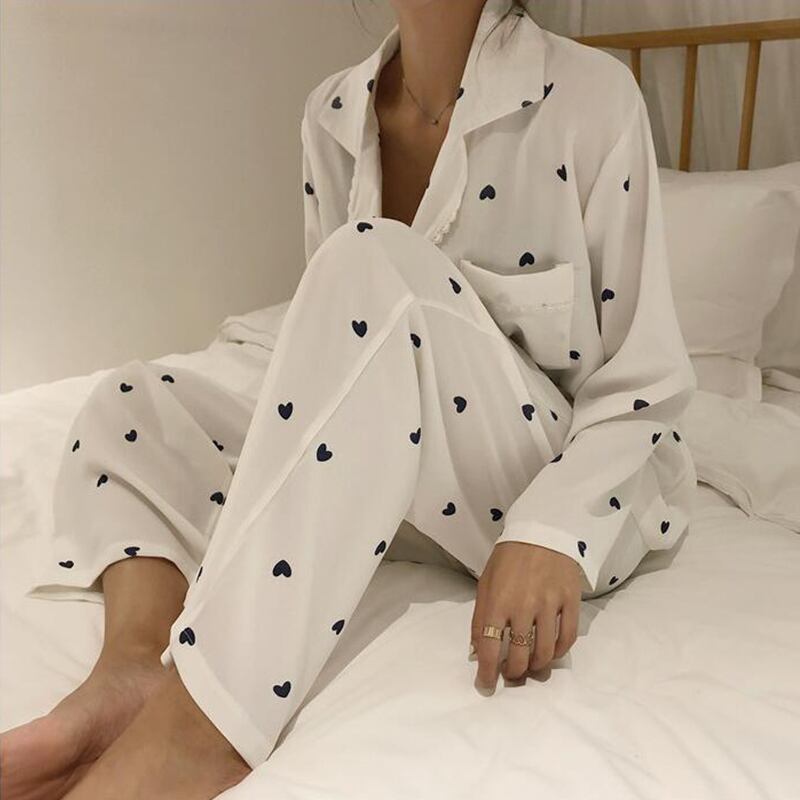 【送料無料】2色 ルームウェア レディース パジャマ 上下セット パンツ 部屋着 寝間着 テーラードカラー 襟つき おしゃれ 大きいサイズ 大人可愛い Vネック セクシー キュート 長袖 長ズボン 前開き ハート柄 個性的 カジュアル ガーリー きれいめ ルーズ ゆったり 大きいサイズ 白 ホワイト ピンク くすみカラー 大人かわいい こなれ感 インスタ映え アイテム ファッション お泊り M L XL XXL XXXL 2L 3L 春 秋 トレンド 抜け感 オシャレ 楽ちん リラックス db1550