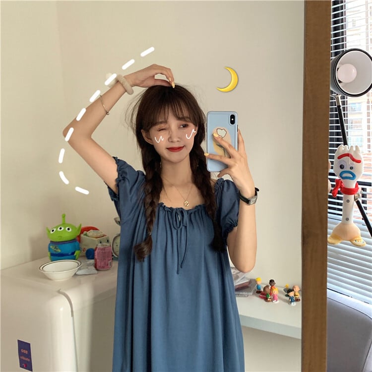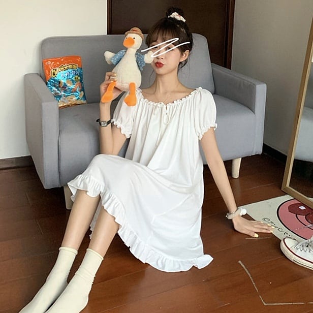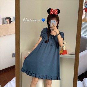 【送料無料】2色 ルームウェア レディース スカート ミニワンピ ワンピース ミニスカート ミニ丈 膝上 部屋着 寝間着 パジャマ 無地 リボン パフスリーブ 半袖 Aライン テントライン 裾フリル ギャザー ラウンドネック 襟なし ガーリー シンプル きれいめ かわいい 可愛い キュート 青 ブルー ホワイト 白 くすみカラー インスタ映え ファッション コーデ デート 学生 休日 お泊り 旅行 10代 20代 春 夏 トレンド 抜け感 オシャレ 柔らかい リラックス 楽ちん ゆったり db1551