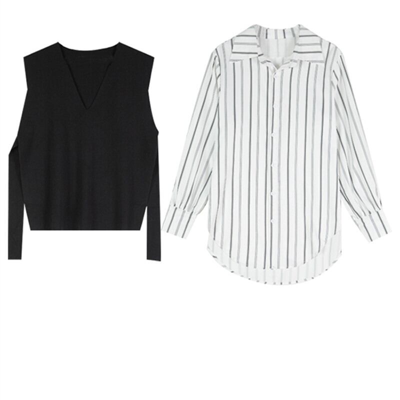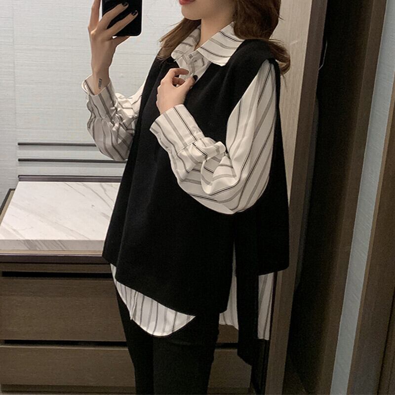 【送料無料】トップス レディース ツーピース 2点セット シャツ ストライプ 長袖 襟付き ベスト ニット レイヤード 重ね着 大きいサイズ おしゃれ ルーズ クール きれいめ かっこいい 個性的 メンズライク マニッシュ モード系 白 ホワイト 黒 ブラック 大人 スマートカジュアル シンプル インスタ映え ファッション 大人カジュアル コーデ 通学 通勤 学生 休日 OL オフィス ビジネス 主役級 20代 30代 春 秋トレンド 抜け感 M L XL 2XL 3XL 4XL オシャレ db1567