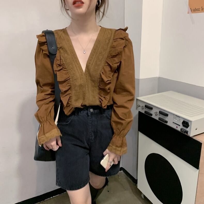【送料無料】2色 トップス レディース Vネック シャツ ブラウス フリル レース 長袖 パフスリーブ おしゃれ 大人可愛い 長袖 個性的 きれいめ カジュアル エレガント ガーリー レトロ 華やか 無地 白 ホワイト 茶色 ブラウン 大人かわいい こなれ感 インスタ映え アイテム 韓国 ファッション 大人カジュアル 大人女子 コーデ デート 通学 学生 休日 公園デビュー 女子会 お出かけ 主役級 10代 20代 30代 春 秋 トレンド 抜け感 オシャレ S M L XL 普段使い db1583