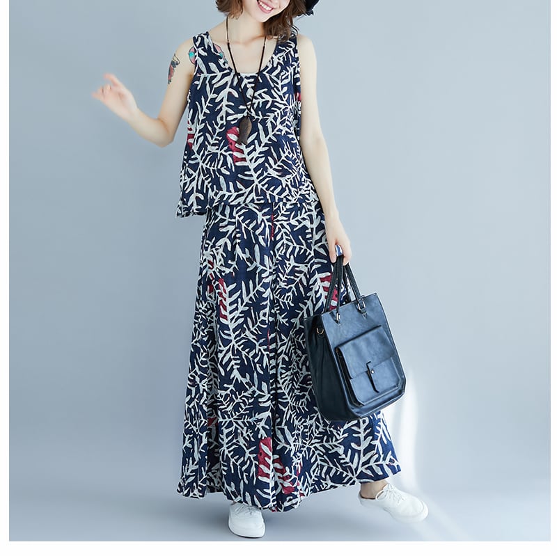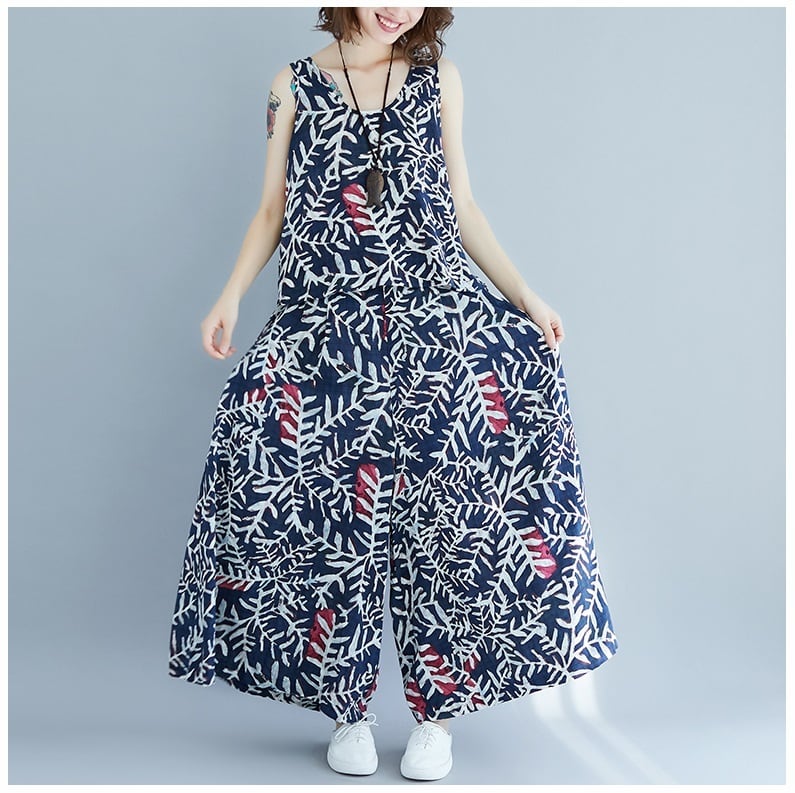 【送料無料】 セットアップ パンツ レディース ワイドパンツ 上下セット カジュアル きれいめ 花柄 パンツドレス リゾート ファッション XL 2xl 大きいサイズ ノースリーブ ルーズ ジレ おしゃれ 可愛い ズボン ボトムス エスニック風 オリエンタル ラウンドネック ブルー 青 ネイビー 薄手 夏コーデ オシャレ ママ 20代 30代 40代 春 夏 秋 こなれ感 個性的 存在感 トレンド ドローストリング 新作 海外 セレブ ラージサイズ ラフ 抜け感 シンプル 体型カバー db1468