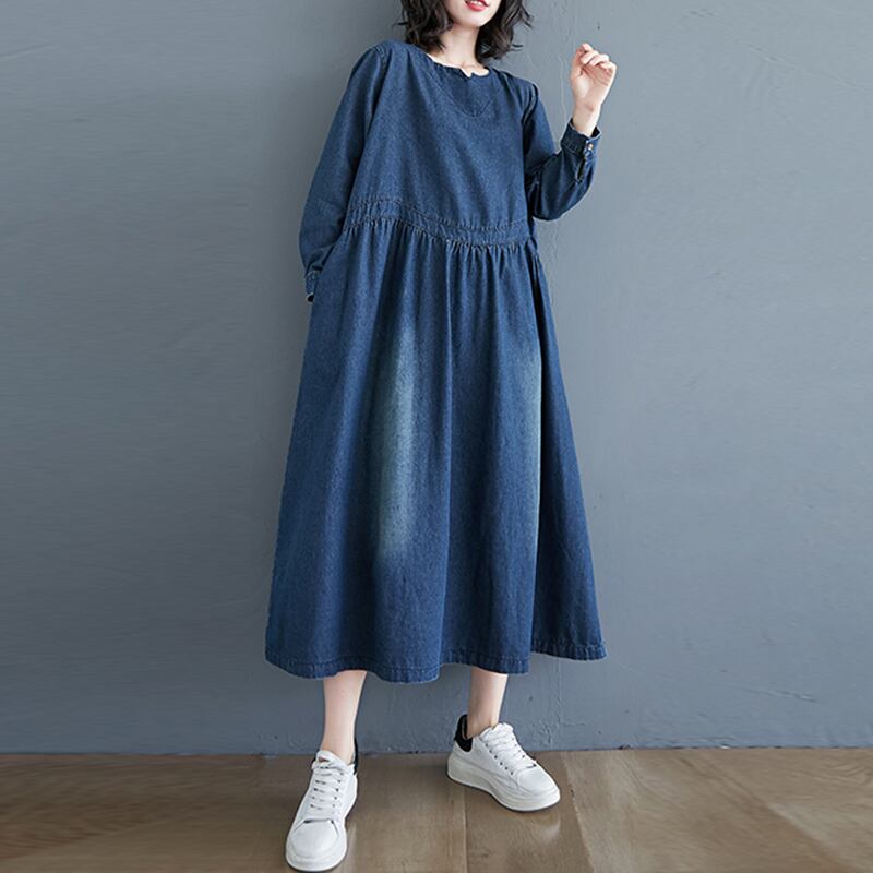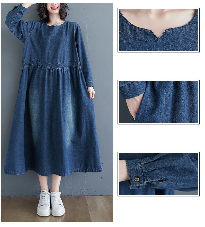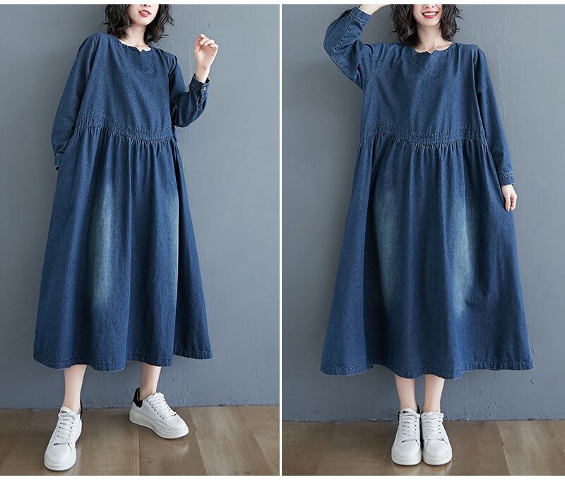 【送料無料】 デニム ワンピース レディース ミモレ丈 ワンピ 長袖 フレアスカート 無地 ラウンドネック Vネック 袖あり ゆったり ワンピース 大きいサイズ XL 2XL おしゃれ 大人可愛い 体型カバー 個性的 レトロ フェミニン きれいめ シンプル オーバーサイズ プラスサイズ 襟なし ブルー 青 重ね着 大人かわいい こなれ感 ママ ファッション 大人カジュアル 休日 公園デビュー お出かけ 主役級 10代 20代 30代 40代 春 夏 トレンド 抜け感 楽ちん だぼだぼ db1464