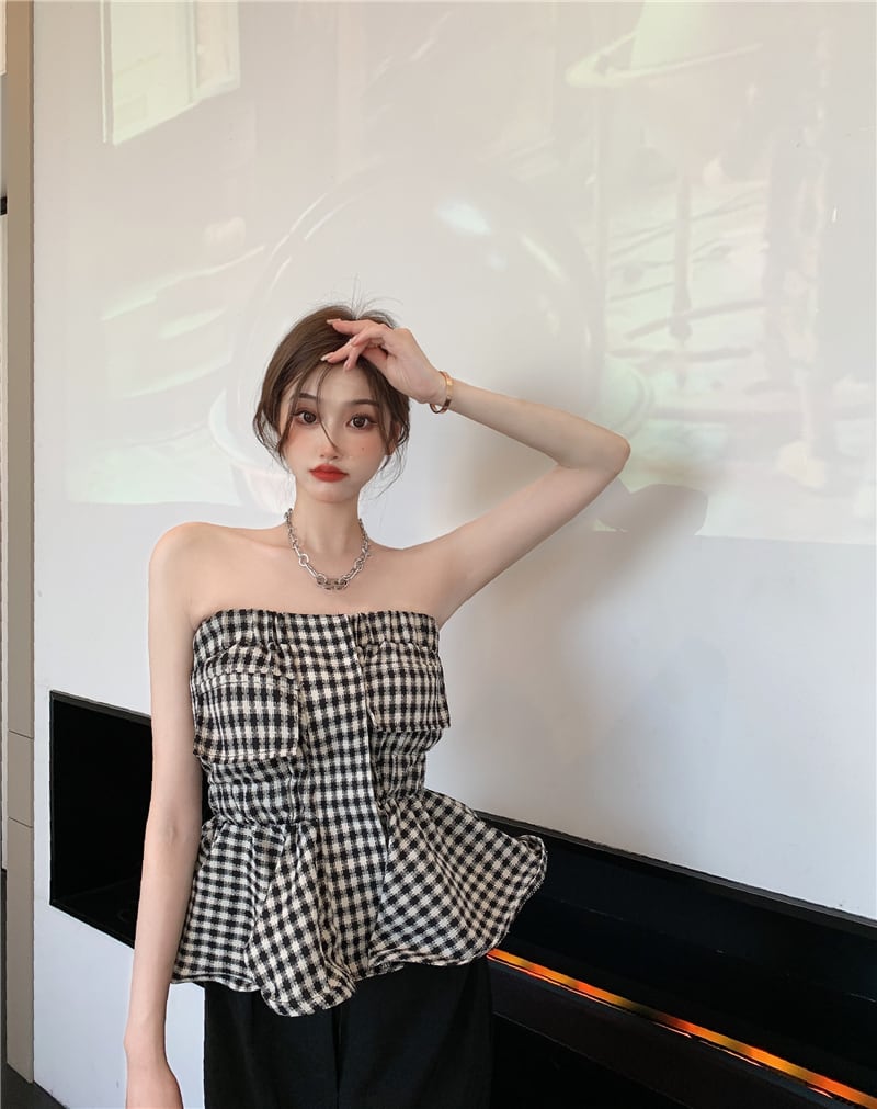 【送料無料】トップス レディース チューブトップ ペプラム ギンガムチェック 黒 白 かわいい レトロ ガーリー トップス 春 夏 袖なし シャツ ブラウス チェック柄 モノトーン フリル おしゃれ 大人可愛い 個性的 華やか きれいめ フェミニン ドール系 大人かわいい こなれ感 インスタ映え アイテム 韓国 ファッション 大人カジュアル コーデ デート 休日 お出かけ 主役級 10代 20代 トレンド 抜け感 オシャレ 存在感 db1483