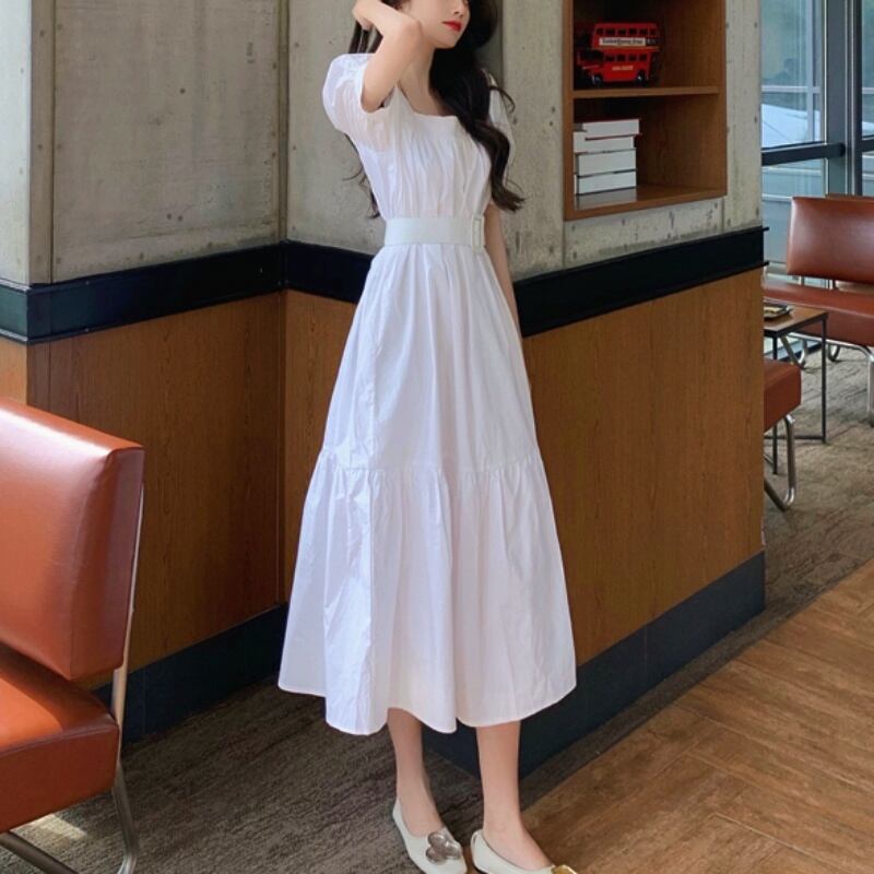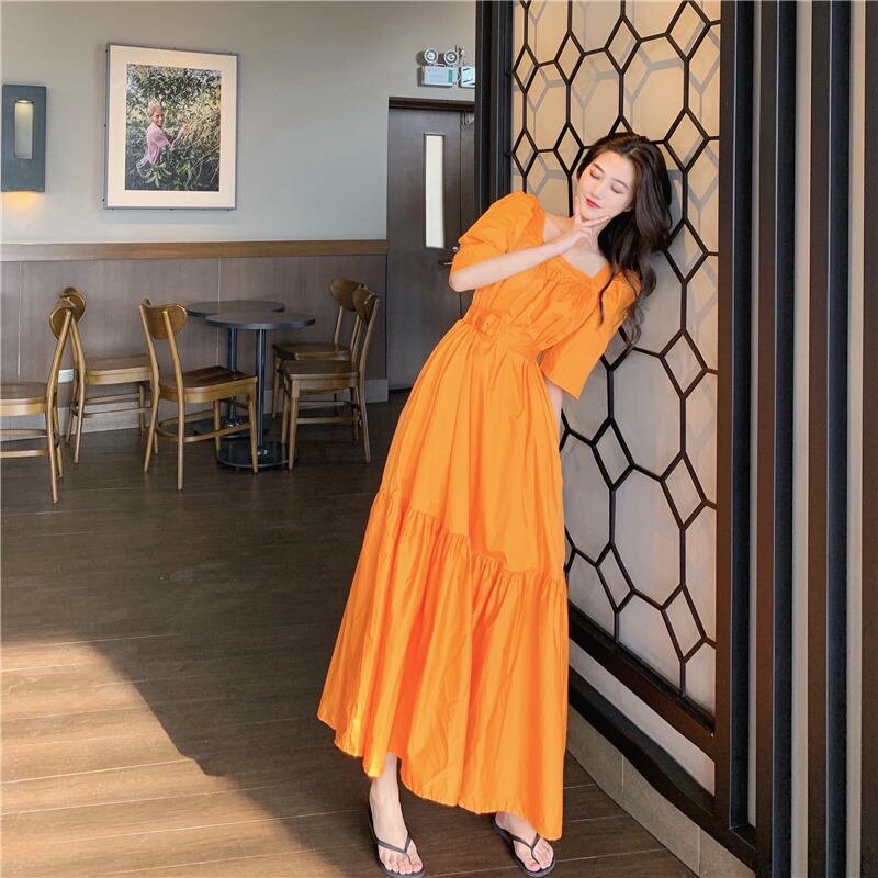 【送料無料】3色 ワンピース レディース ミモレ丈 フレア ティアード パフスリーブ ワンピ 大人可愛い おしゃれ 無地 ロングワンピース スクエアネック 襟なし ベルト 裾フレア 半袖 無地 ワンピースドレス リッチ かわいい きれいめ 清楚 華やか 存在感 姫 レトロ S M L 白 ホワイト ブルー 青 オレンジ ブラック パーティー こなれ感 インスタ映え アイテム 韓国 ファッション お出かけ イベント 主役級 10代 20代 春 夏 ワンピドレス 清楚 db1631
