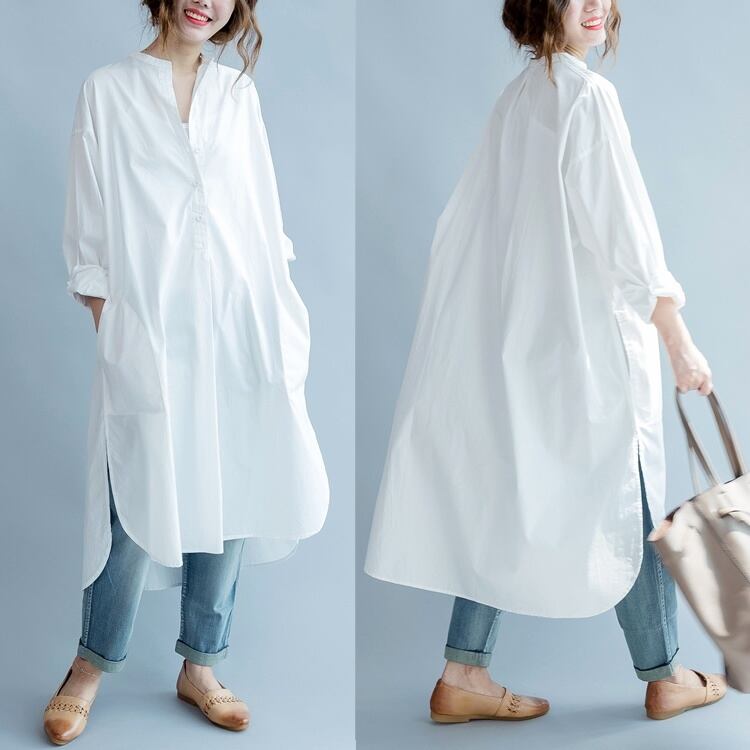 【送料無料】トップス レディース 白 シャツ ロング丈 バンドカラー スタンドカラー 襟付き 長袖 白シャツ シャツワンピ ロングシャツ シンプル ナチュラル きれいめ 体型カバー ゆったり ルーズ ラフ サイドスリット オーバーサイズ 大人かわいい 大人女子 爽やか ポケット ボタン 白 ホワイト 無地 こなれ感 インスタ映え アイテム 韓国 ファッション カジュアル コーデ 普段使い お買い物 ママ 楽ちん 20代 30代 40代 春 夏 秋 トレンド 抜け感 オシャレ ワンピース db1640