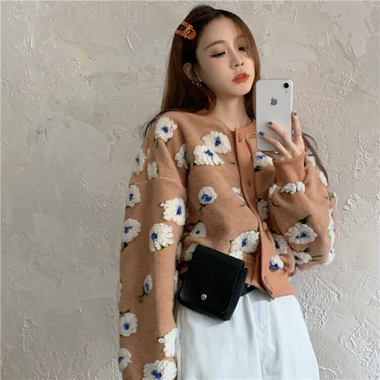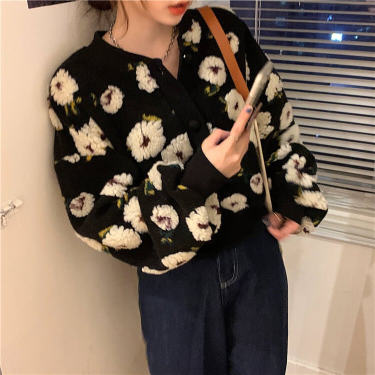 【送料無料】2色 トップス レディース 長袖 カーディガン モコモコ もこもこ ボア ニット風 ショート丈 襟なし 萌袖 前開き ボタン おしゃれ 大人可愛い 個性的 レトロ ガーリー ルーズ フェミニン ゆったり オーバーサイズ 花柄 黒 ブラック オレンジ 大人かわいい こなれ感 インスタ映え アイテム 韓国 ファッション カジュアル コーデ デート 通学 学生 お出かけ 普段使い 女子会 お買い物 主役級 10代 20代 春 秋 冬 抜け感 オシャレ ハイウエスト 着回し 暖かい db1645