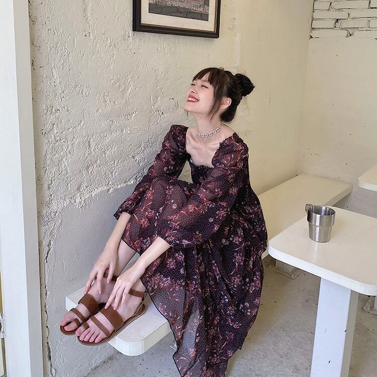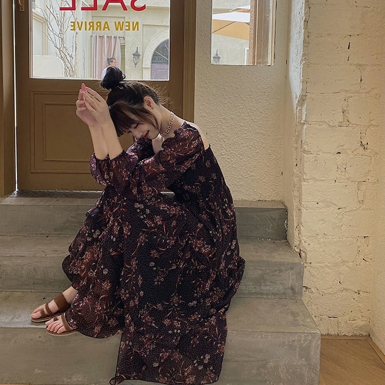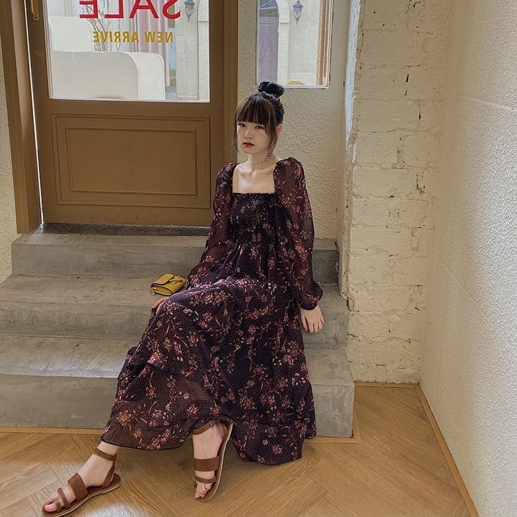 【送料無料】ワンピース レディース ロングワンピース ロングスカート フレアワンピース ティアード パフスリーブ スクエアネック バックシャン 背中開き 透け感 シースルー シフォン おしゃれ 大人可愛い 長袖 個性的 レトロ ガーリー 大人っぽい エレガント 上品 花柄 襟なし 華やか 紫 ベリー こなれ感 インスタ映え アイテム 韓国 ファッション コーデ デート 学生 休日 パーティー お出かけ 主役級 10代 20代 秋 トレンド S M L 抜け感 オシャレ ハイウエスト 柔らかい db1667