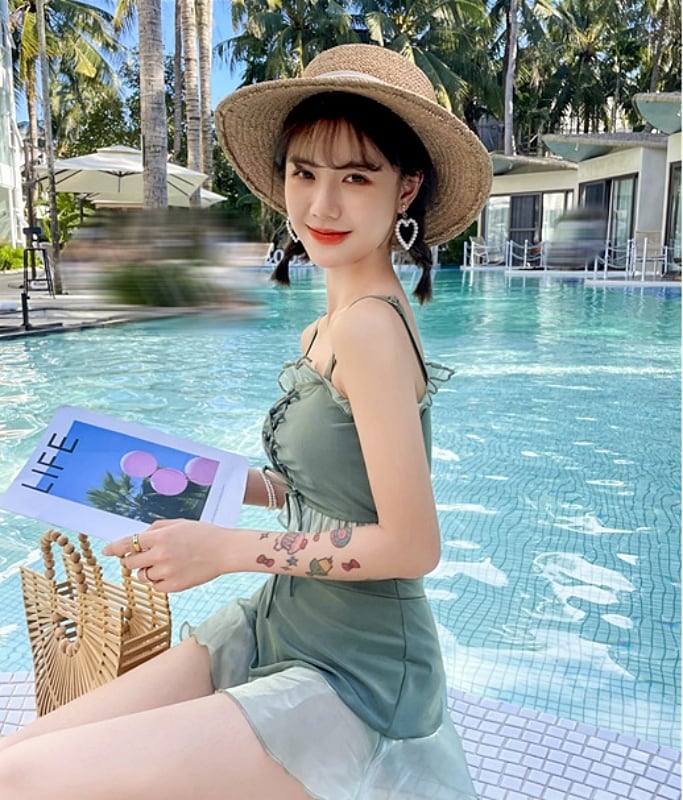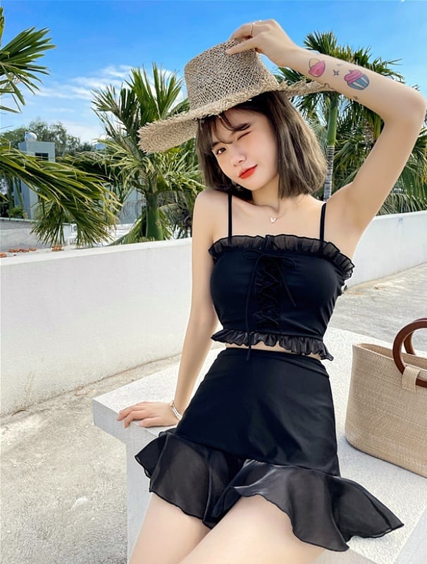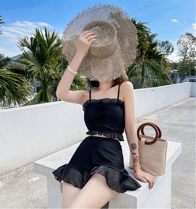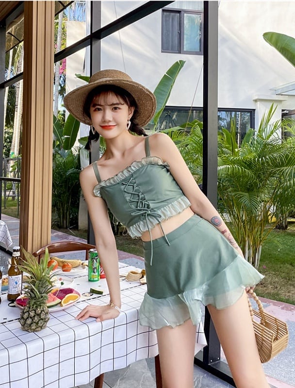 【送料無料】2色 水着 レディース ビキニ ビスチェ コルセット風 黒 上下セット かわいい ラブリー 体系カバー スカート レースアップ フリル レース 透け感 ミニスカート ボクサーパンツ 裾フレア ハイウエスト お腹カバー 韓国 水着 安い セクシー キュート ガーリー 大人可愛い かわいい くすみカラー 緑 グリーン 黒 ブラック こなれ感 インスタ映え カジュアル お腹カバー 日焼け防止 プール リゾート ビーチ 10代 20代 S M L XL 夏 大きいサイズ スイムウェア db1678