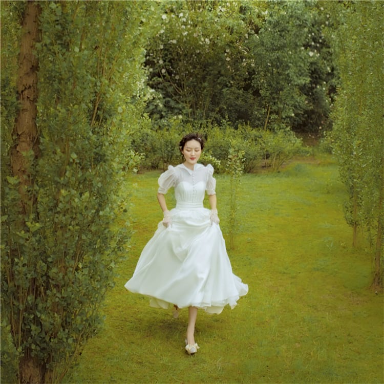 【送料無料】ウェディングドレス 二次会 花嫁ドレス 結婚式 ドレス パーティードレス Aライン レトロ ガーリー パフスリーブ クラシカル 袖あり 大きいサイズ xl ロングドレス 白 半袖 襟あり ボタン カジュアル ブラウス風 レストラン お呼ばれ 披露宴 リゾート 海外 挙式 ブライダル 前撮りドレス 後撮り 写真館 撮影 森 高原 春 夏 秋 冬 10代 20代 30代 大人 上品 可愛い きれいめ シンプル モダン インスタ映え dress 個性的 主役級 イベント 衣装 舞台 wd0069
