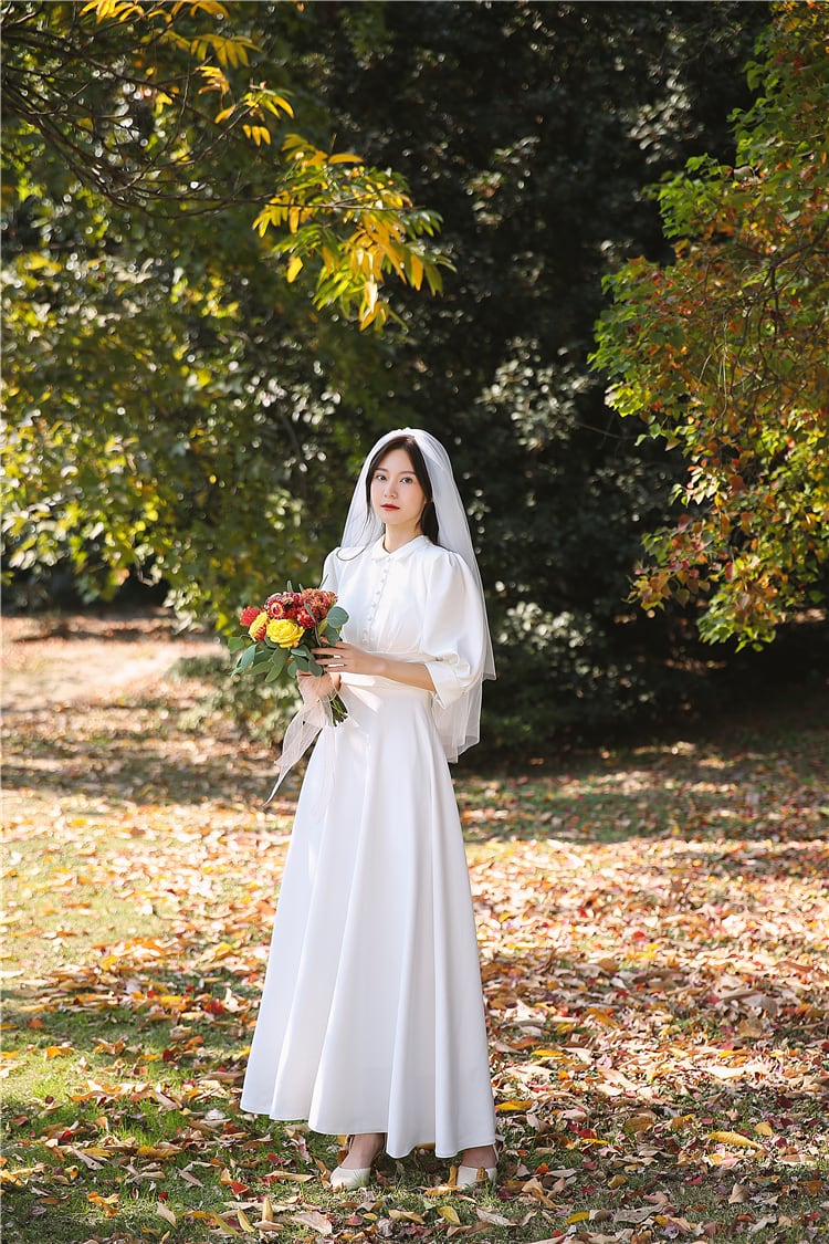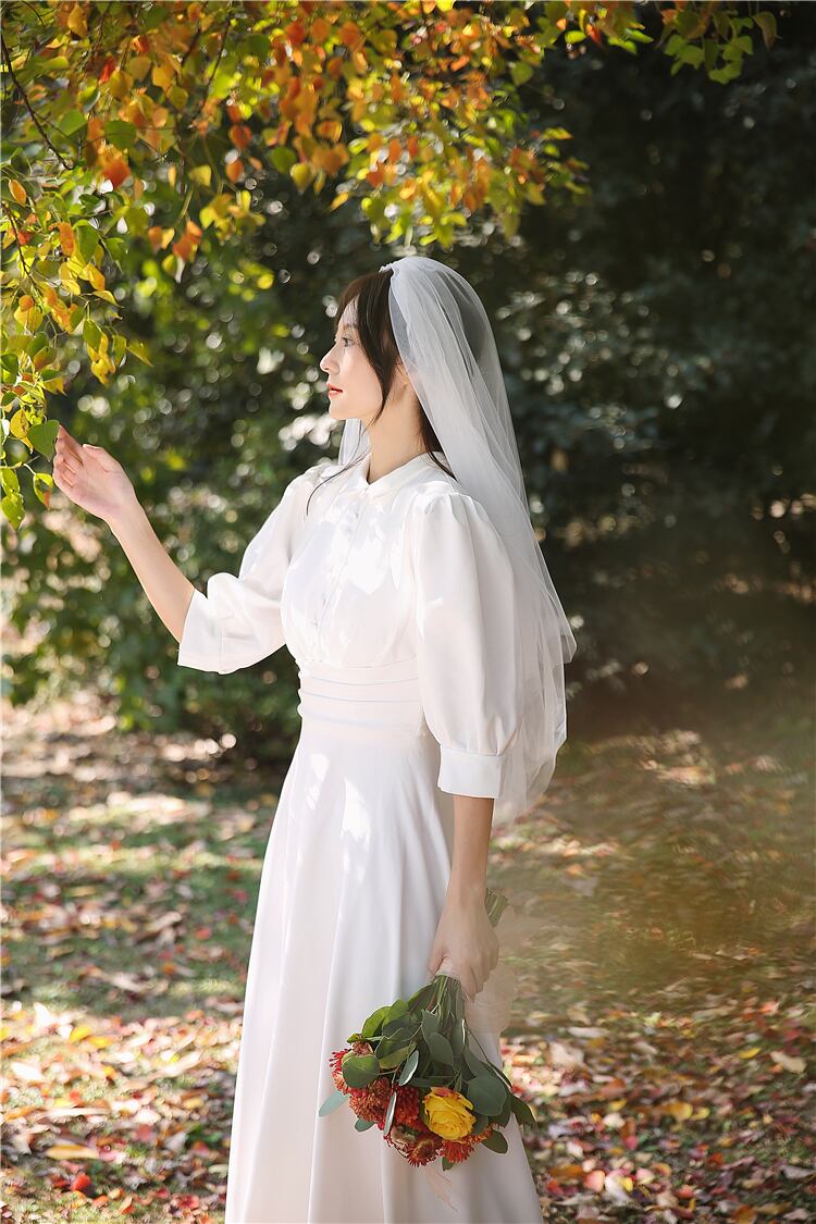 【送料無料】ウェディングドレス レディース 二次会 花嫁ドレス 結婚式 パーティードレス Aライン レトロ 清楚 シンプル 地味 控えめ パフスリーブ 5分袖 五分袖 クラシカル 袖あり ロングドレス 白 ホワイト 襟付き 襟あり ボタン カジュアル ブラウス風 レストラン ガーデン お呼ばれ 披露宴 海外 挙式 ブライダル 前撮り 後撮り 写真館 撮影 森 高原 春 秋 冬 10代 20代 30代 大人 上品 かわいい きれいめ シンプル インスタ映え 個性的 主役級 無地 衣装 舞台 wd0073
