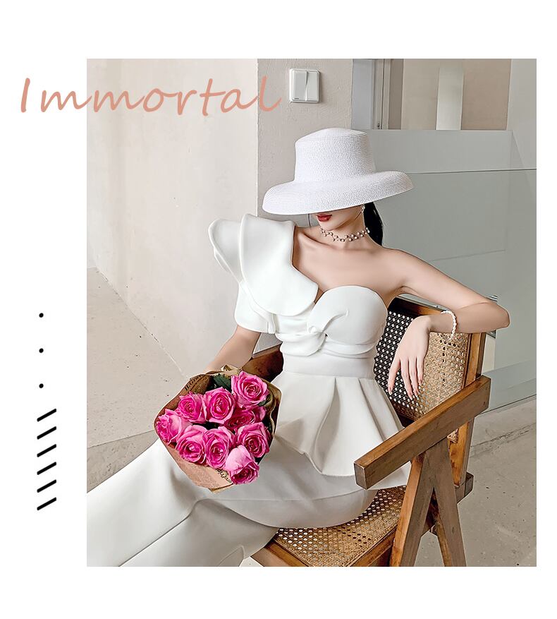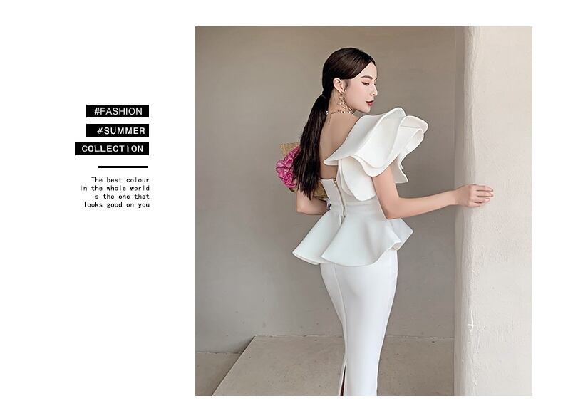 【送料無料】ウェディングドレス レディース 二次会 花嫁ドレス 結婚式 イブニングドレス パーティードレス マーメイドライン パフスリーブ セクシー クール フェミニン スタイリッシュ 存在感 華やか ワンショルダー 大きいサイズ 2XL ミモレ丈 白 ホワイト 襟なし カジュアル スリム タイト おしゃれ オシャレ レストラン お呼ばれ 披露宴 リゾート 海外 挙式 ブライダル 写真館 撮影 春 夏 秋 20代 30代 大人っぽい かわいい モダン インスタ映え 個性的 主役級 イベント wd0084