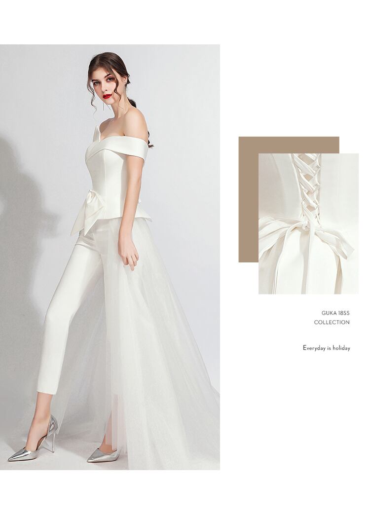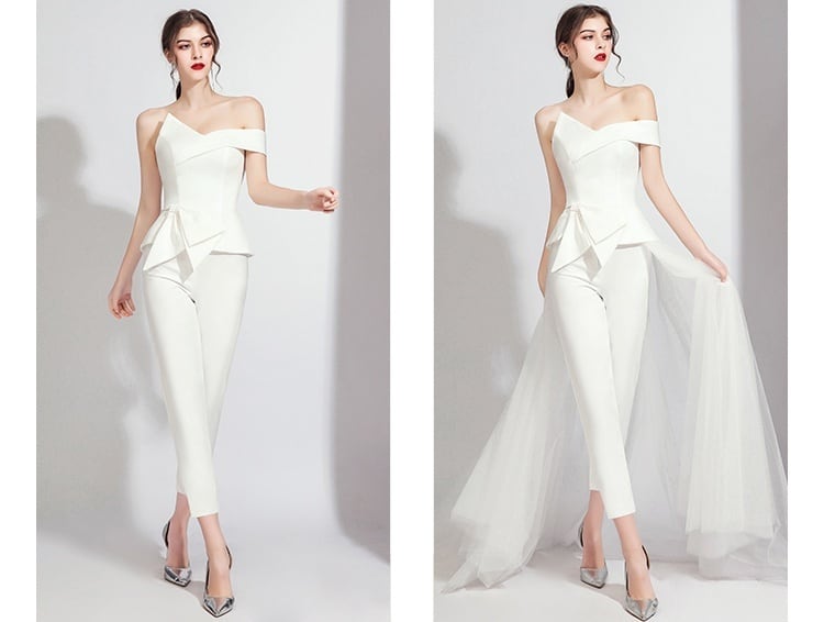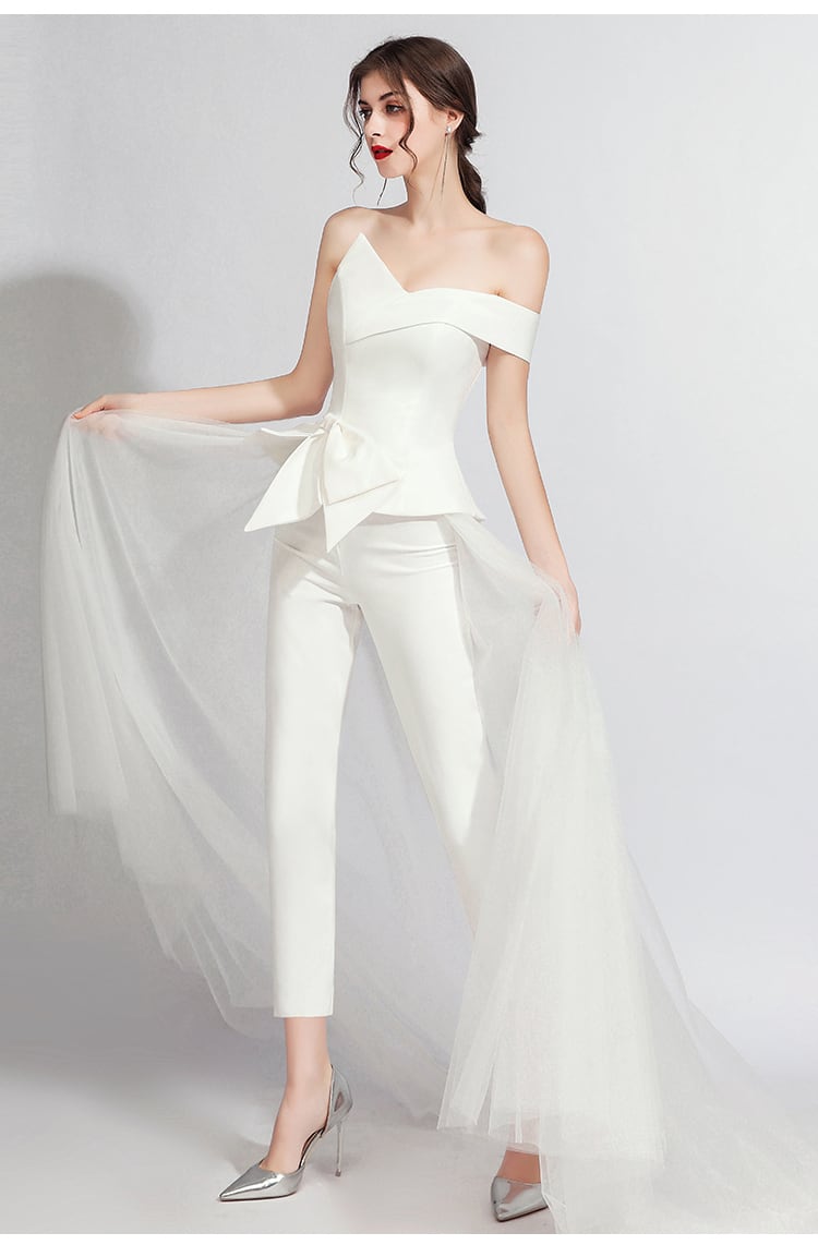 【送料無料】ウェディングドレス レディース パンツドレス 二次会 花嫁ドレス 結婚式 イブニングドレス パーティードレス オフショルダー ワンショルダー スタイリッシュ 7分丈 トレーン 白 ホワイト 黒 ブラック 赤 レッド 朱色 カラードレス カジュアル レストラン お呼ばれ 披露宴 海外 挙式 ブライダル 写真館 撮影 ミニマム婚 春 夏 秋 冬 20代 30代 大人っぽい クール エレガント 大人可愛い 華やか きれいめ シンプル モダン インスタ映え 個性的 主役級 イベント 衣装 wd0092