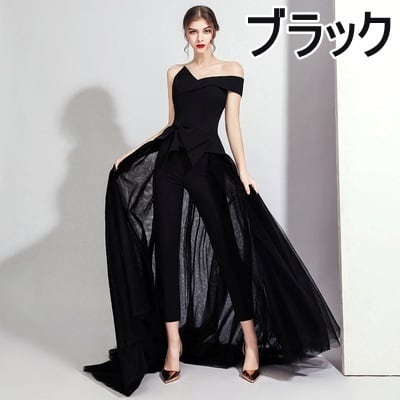 アシンメトリーなオフショルダーが個性を放つ、スタイリッシュなパンツドレス♪