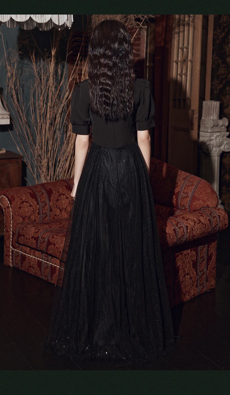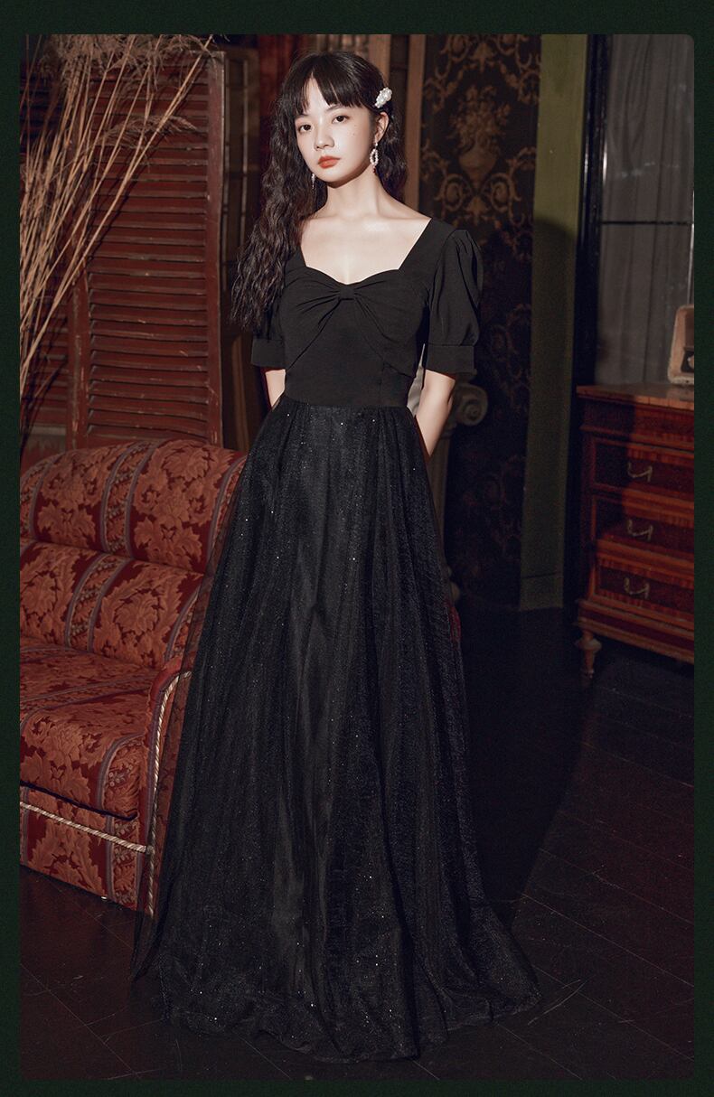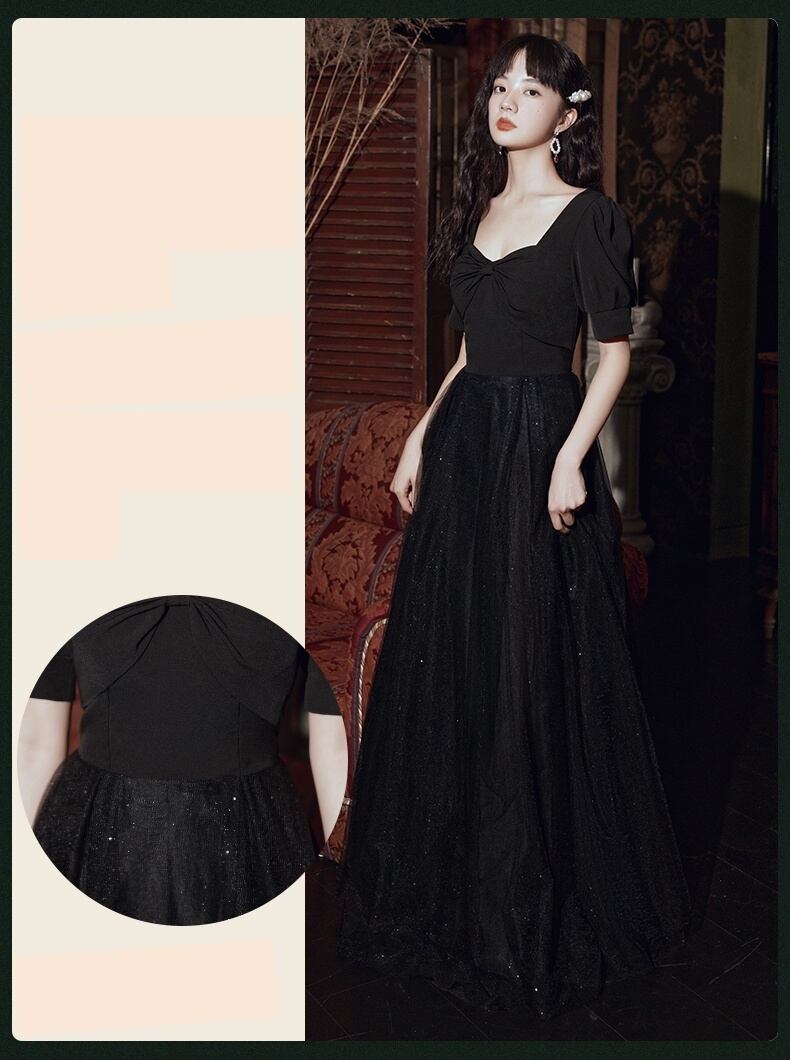 【送料無料】ドレス レディース パーティードレス フォーマルドレス イブニングドレス カジュアル Aライン ロング チュール シフォン 透け感 シースルー 谷間 胸元 リボン レトロ 袖あり パフスリーブ 半袖 キラキラ キュート かわいい 柔らかい ふんわり エレガント 大きいサイズ 2XL 小さいサイズ XS セミフォーマル お呼ばれ 結婚式 披露宴 発表会 演奏会 二次会 二の腕カバー 黒 ブラック 春 夏 秋 冬 10代 20代 イベント 衣装 コーデ 華やか ガーリー おしゃれ no2010