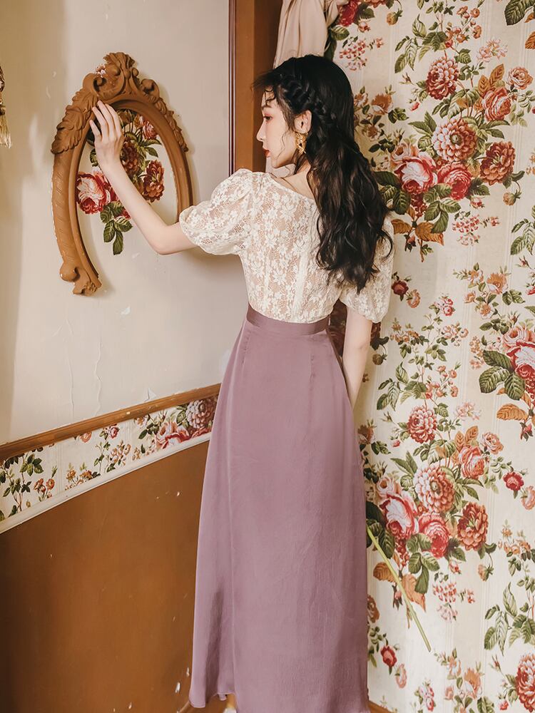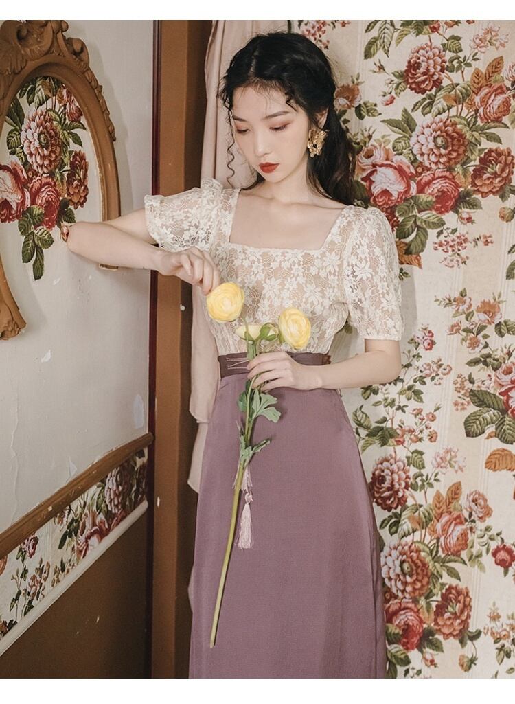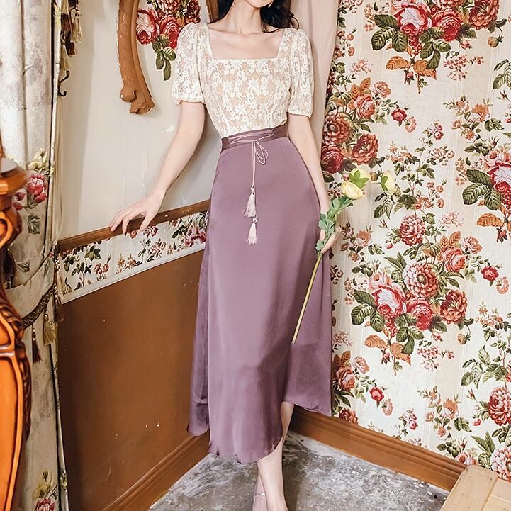【送料無料】ドレス レディース パーティードレス ワンピドレス ドレスワンピース カジュアルドレス スマートカジュアル 切り替えデザイン ミモレ丈 レース ウエストリボン タッセル 細身 スリム スレンダー レトロ クラシカル フェミニン 個性的 袖あり 半袖 スクエアネック エレガント 大人可愛い セミフォーマル お呼ばれ お出かけ デート 女子会 二次会 結婚式 二の腕カバー ニュアンスカラー バイカラー ライラック ピンク 春 夏 20代 イベント 華やか おしゃれ 格上げ 高見え no2027