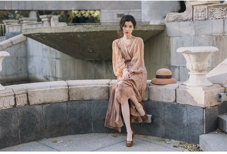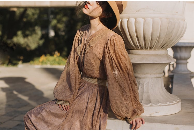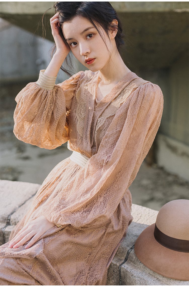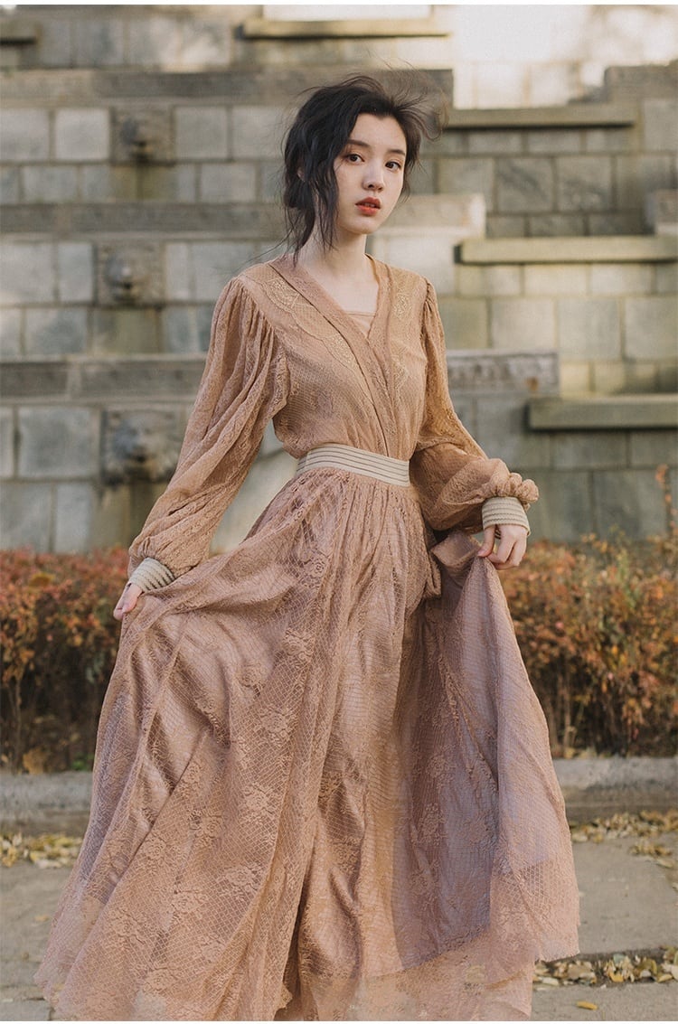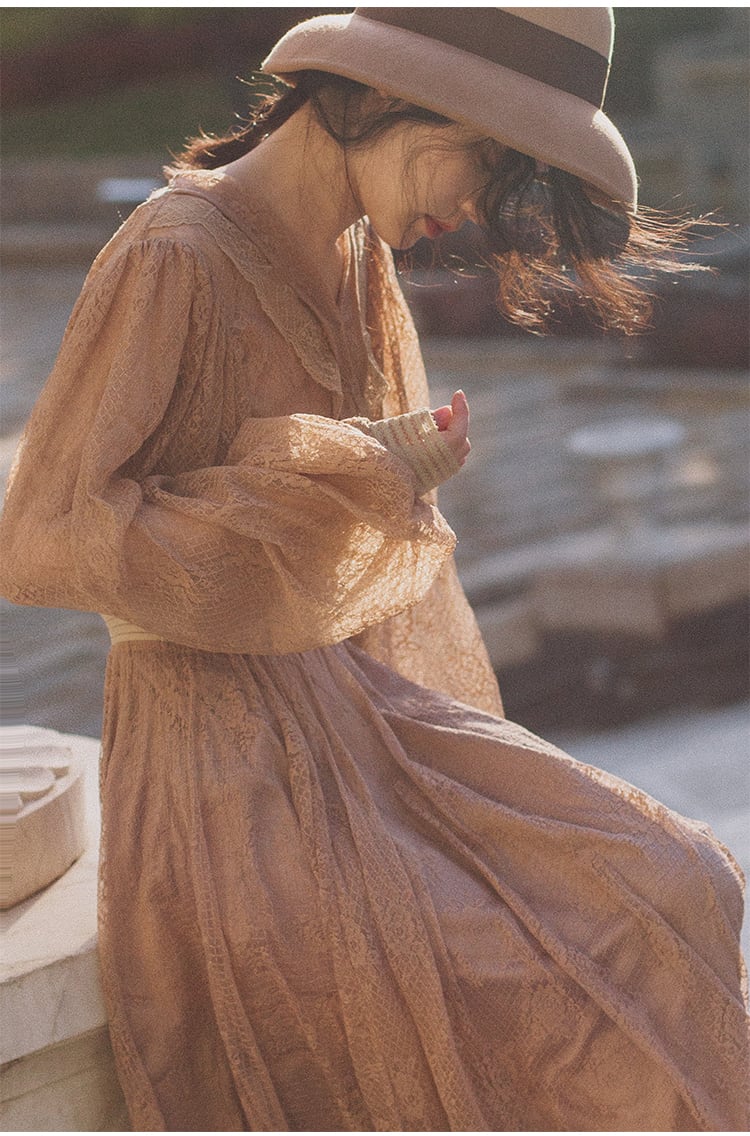 【送料無料】ドレス レディース パーティードレス ワンピドレス ドレスワンピース カジュアルドレス スマートカジュアル ミモレ丈 Aライン レース 透け感 シースルー 柔らかい きれいめ 袖あり ランタンスリーブ 長袖 襟なし Vネック フリル 大人可愛い ナチュラル 素朴 レトロ セミフォーマル お呼ばれ お出かけ 謝恩会 女子会 お茶会 二次会 結婚式 二の腕カバー くすみカラー ベージュ ブラウン 茶色 コーヒー 手染 春 夏 秋 冬 20代 個性的 華やか 抜け感 おしゃれ 安い no2029